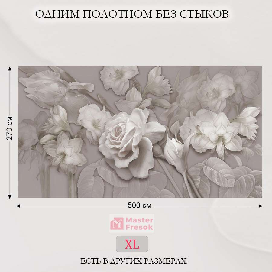 Бесшовные фотообои 3д цветы на бежевом фоне, артикул 13-349, прекрасно подойдут к любому помещению: в гостиную, в спальню, в кухню или в детскую и украсят ваш интерьер. Купить фотообои в интернет магазине MasterFresok можно в нескольких типовых размерах: