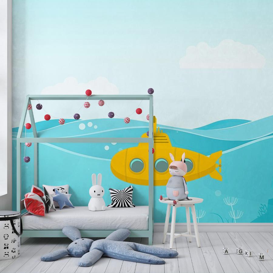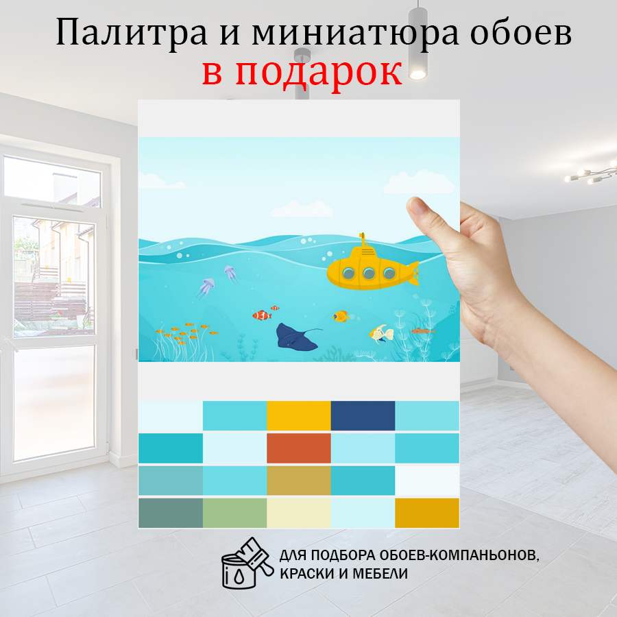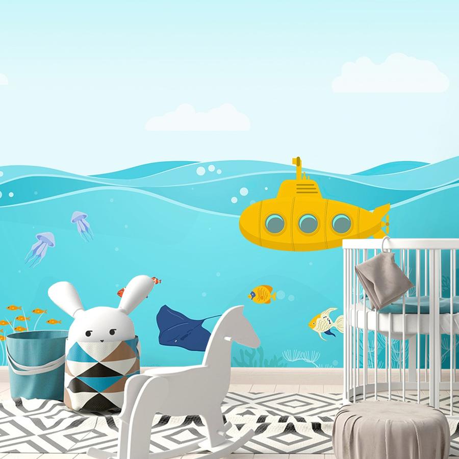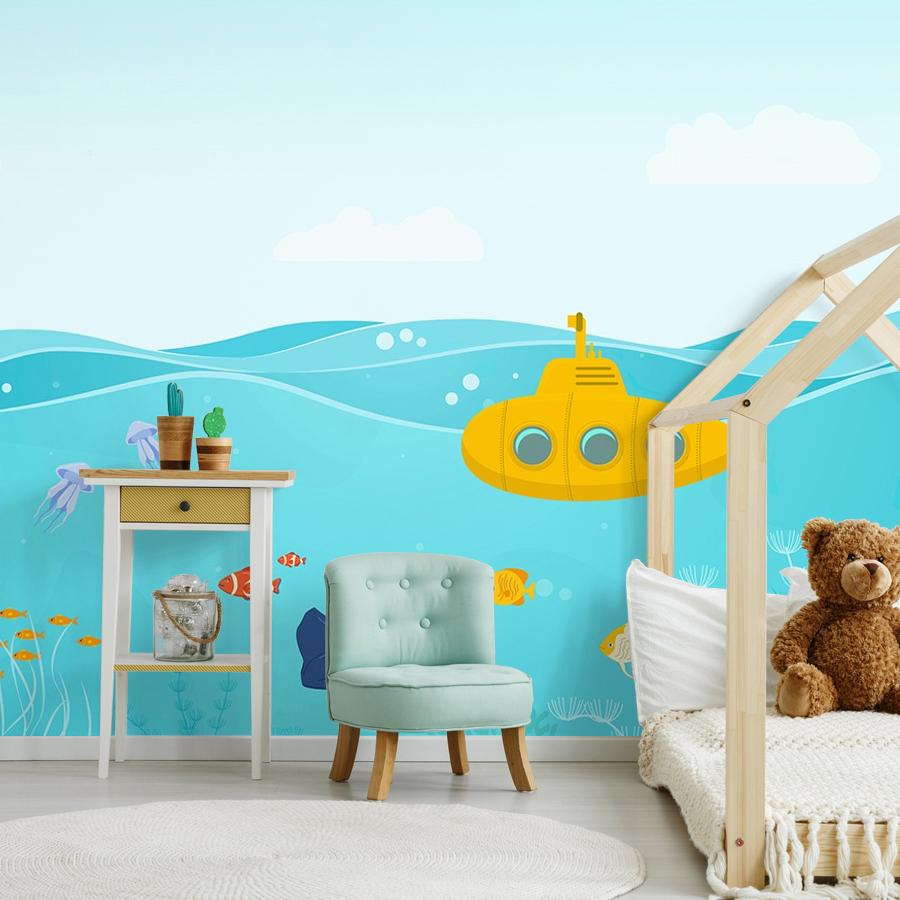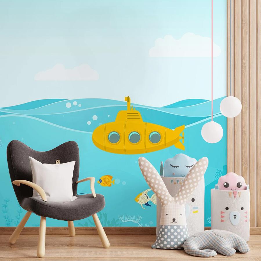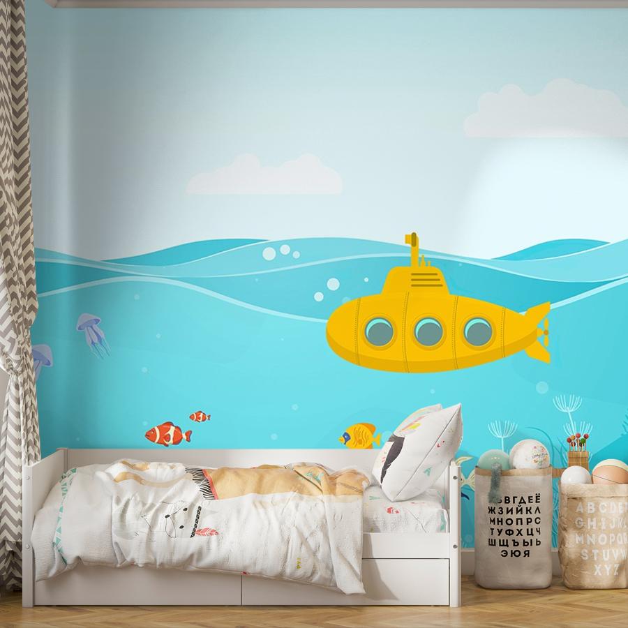 Бесшовные фотообои Желтая подводная лодка, артикул 14-1042, прекрасно подойдут к любому помещению: в гостиную, в спальню, в кухню или в детскую и украсят ваш интерьер. Купить фотообои в интернет магазине MasterFresok можно в нескольких типовых размерах: