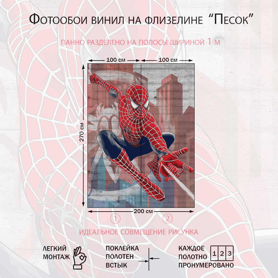 Бесшовные фотообои Человек паук у стены, артикул 7-752, прекрасно подойдут к любому помещению: в гостиную, в спальню, в кухню или в детскую и украсят ваш интерьер. Купить фотообои в интернет магазине MasterFresok можно в нескольких типовых размерах: