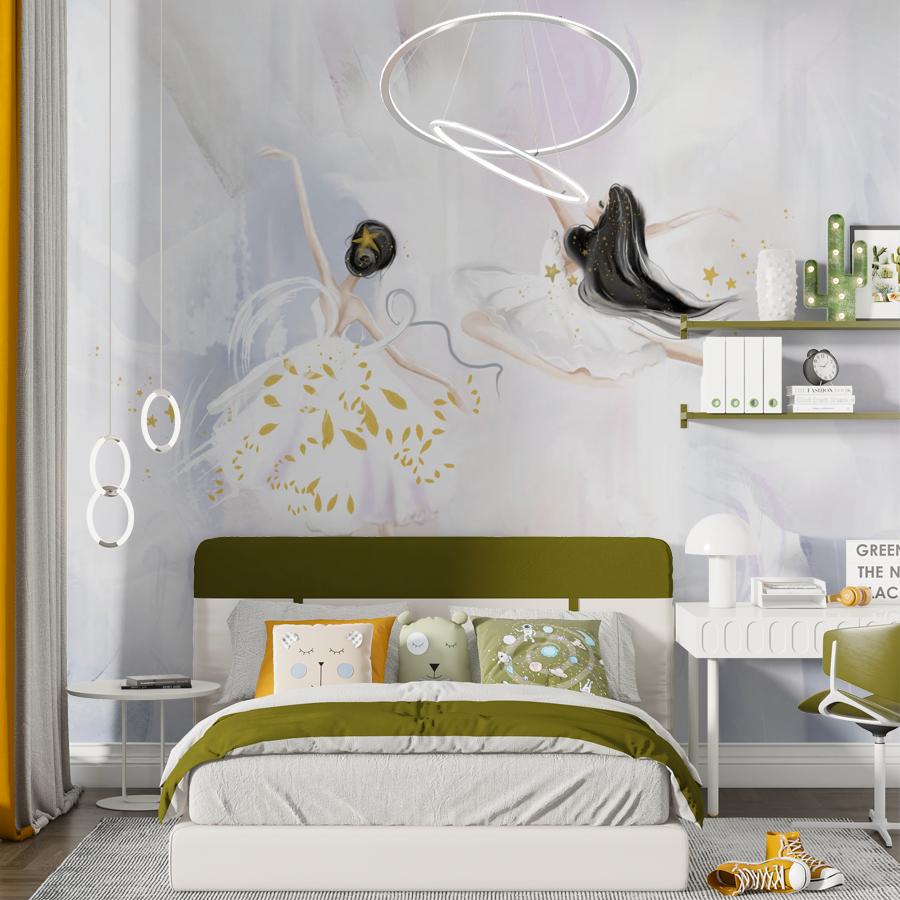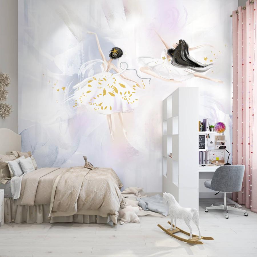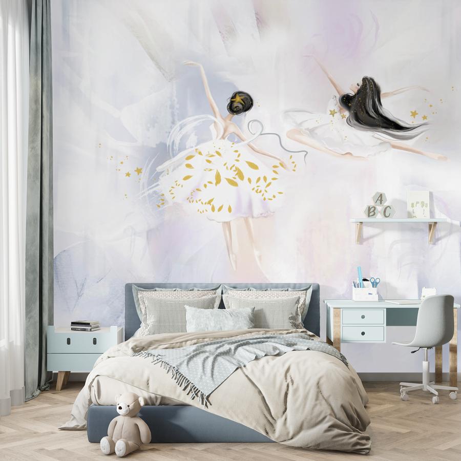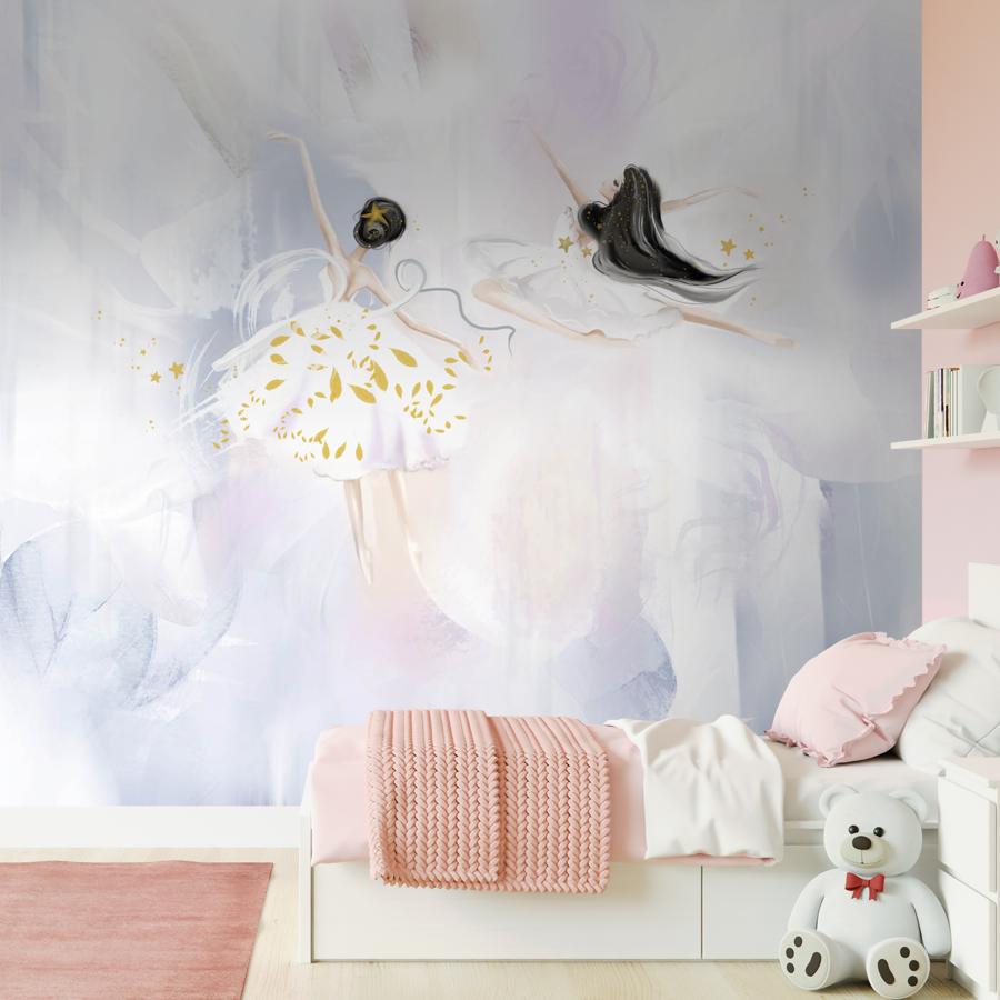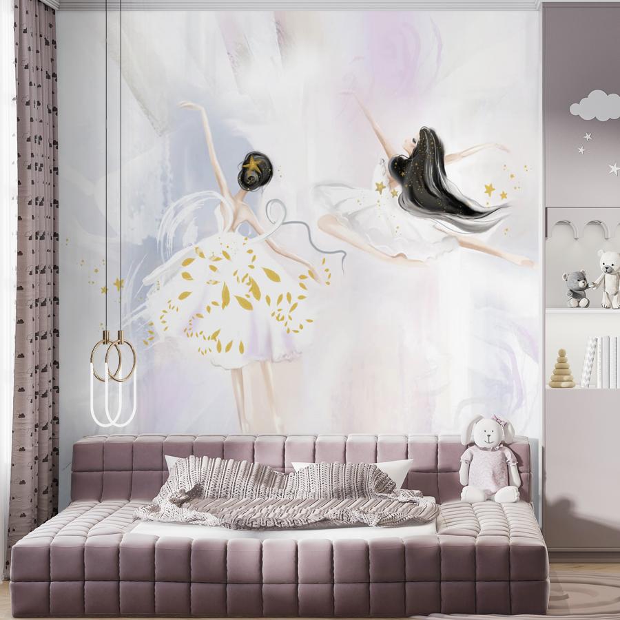 Бесшовные фотообои в спальню Две балерины, артикул 13-660, прекрасно подойдут к любому помещению: в гостиную, в спальню, в кухню или в детскую и украсят ваш интерьер. Купить фотообои в интернет магазине MasterFresok можно в нескольких типовых размерах:
