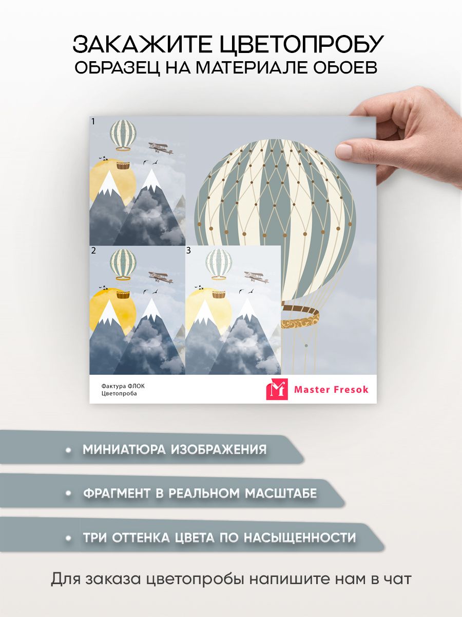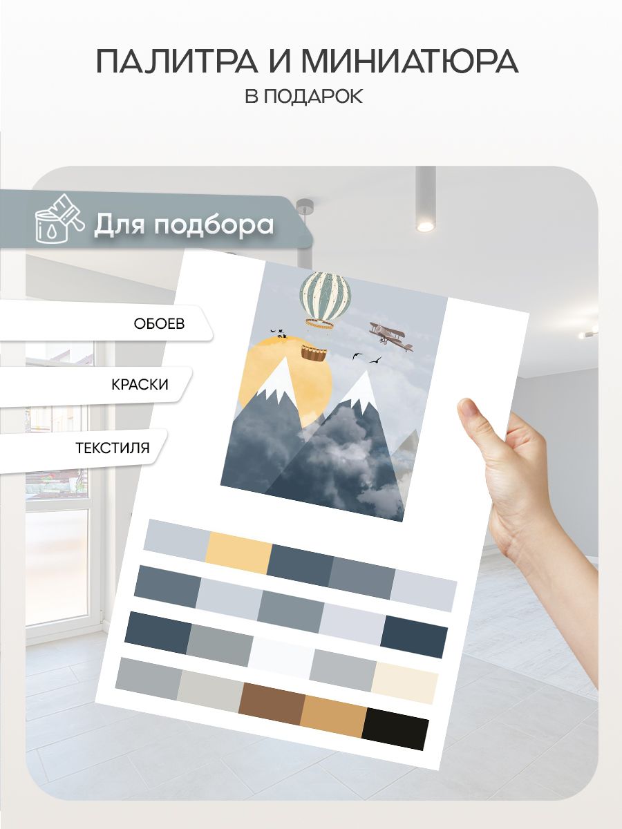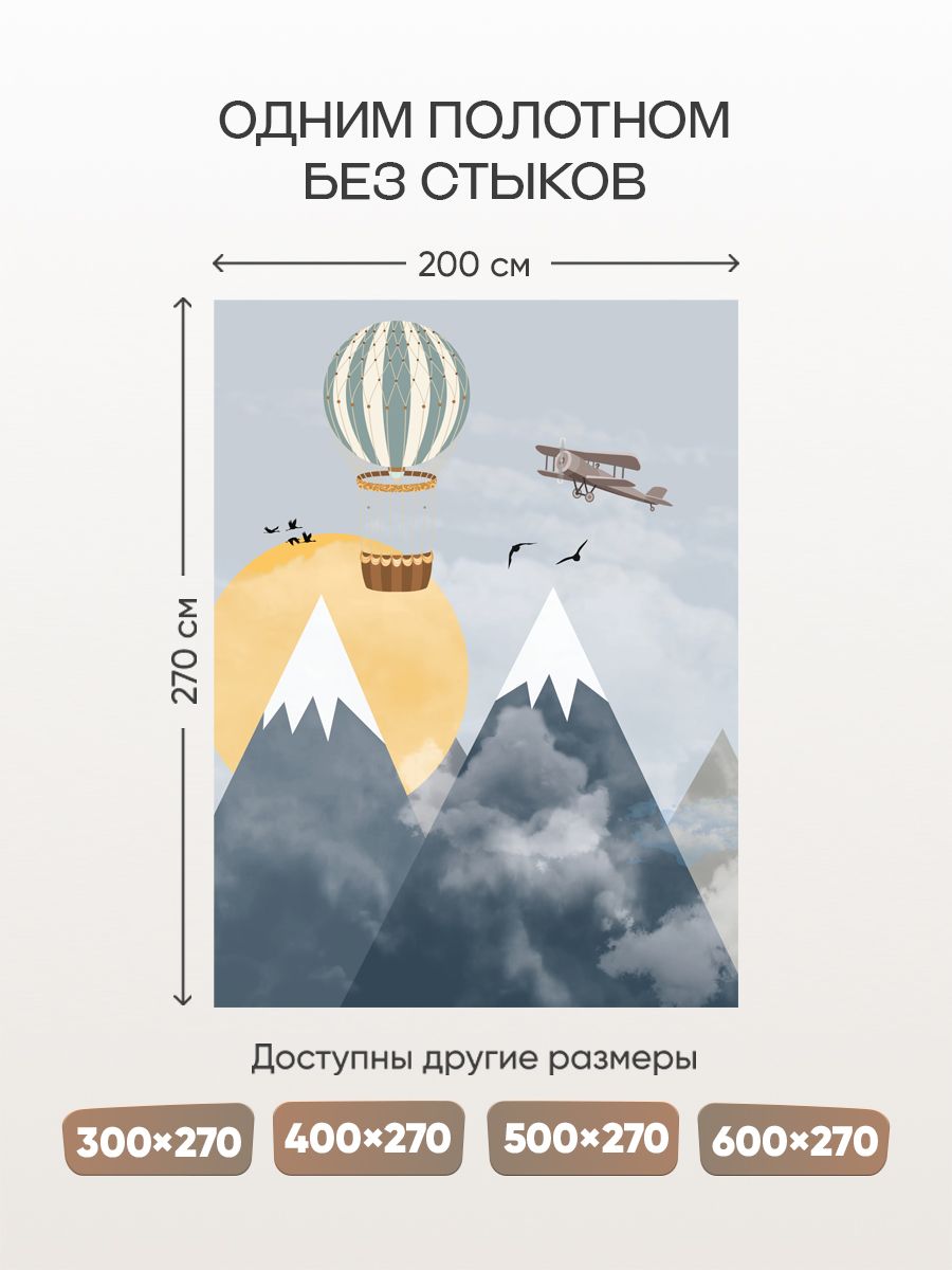 Бесшовные фотообои Воздушные шары и самолёты в сине-серых горах мальчику, артикул 12-1521, прекрасно подойдут к любому помещению: в гостиную, в спальню, в кухню или в детскую и украсят ваш интерьер. Купить фотообои в интернет магазине MasterFresok можно в нескольких типовых размерах: