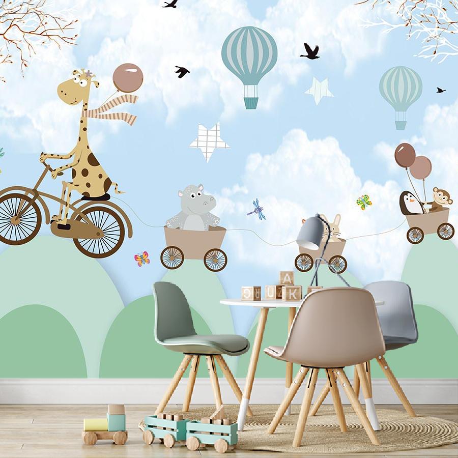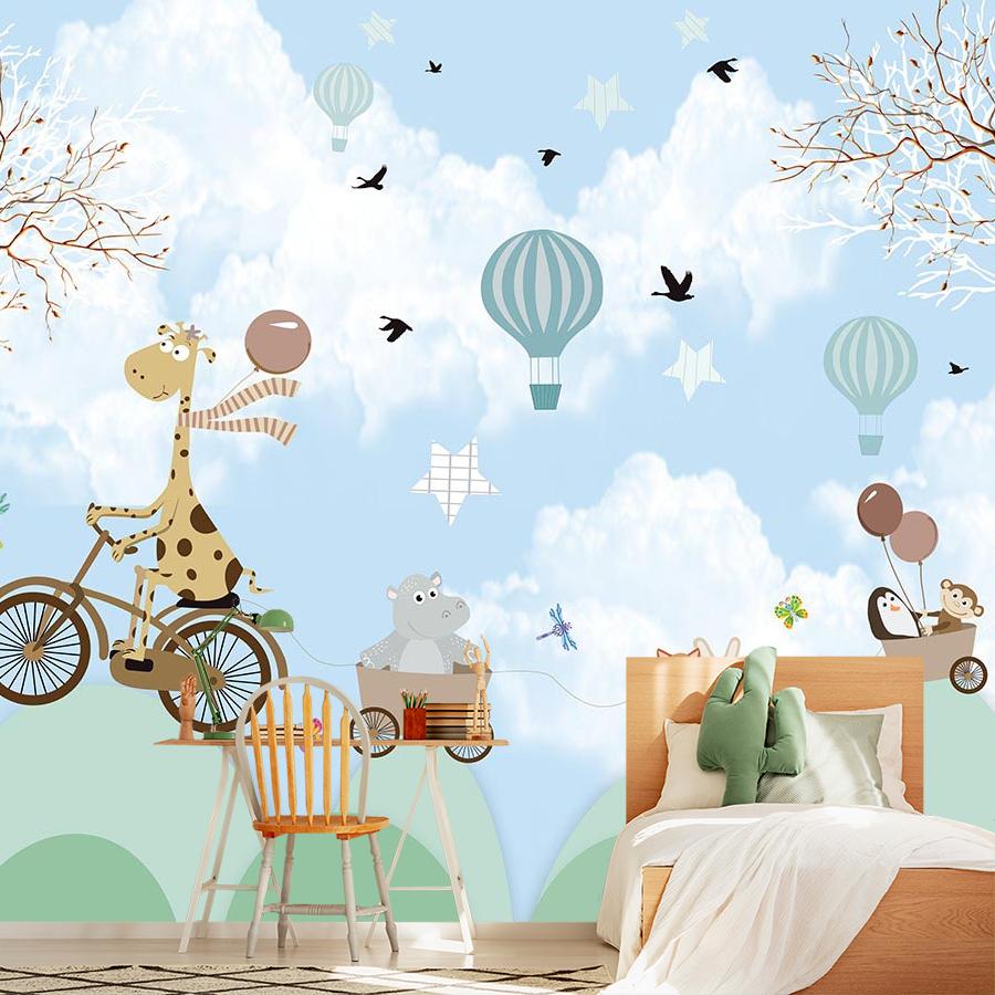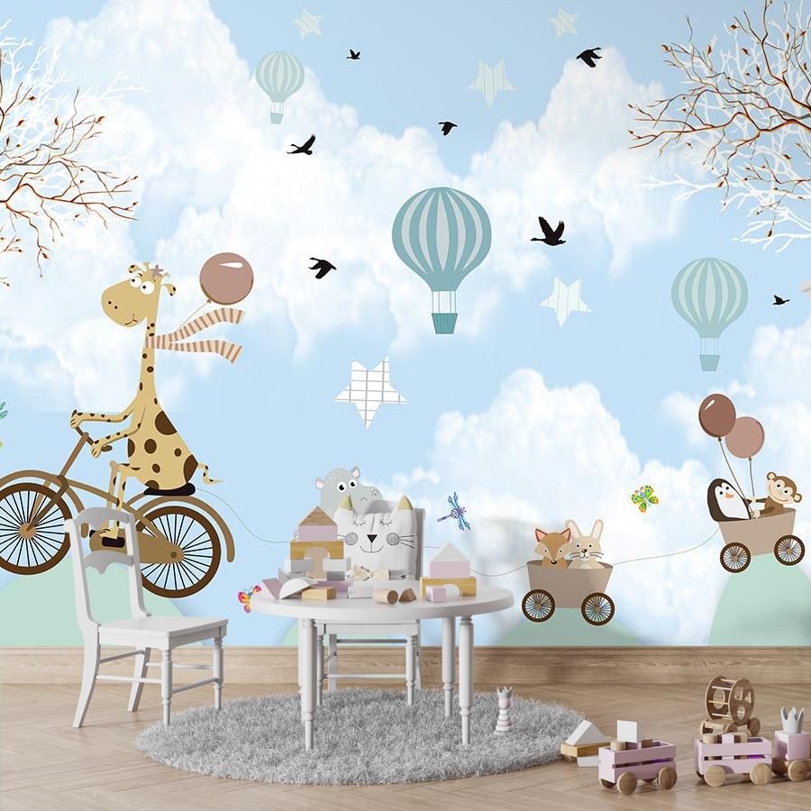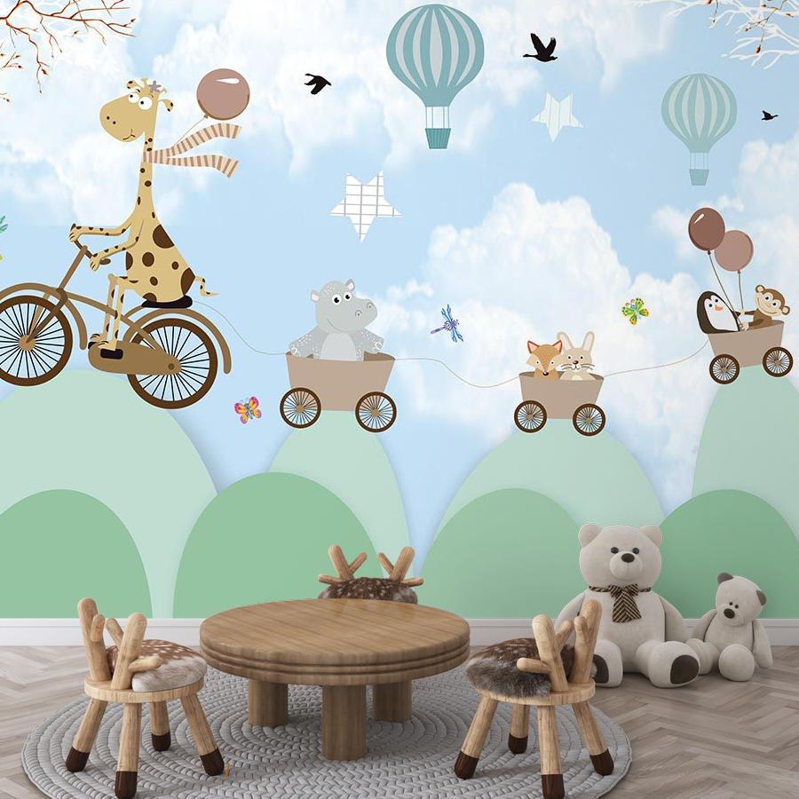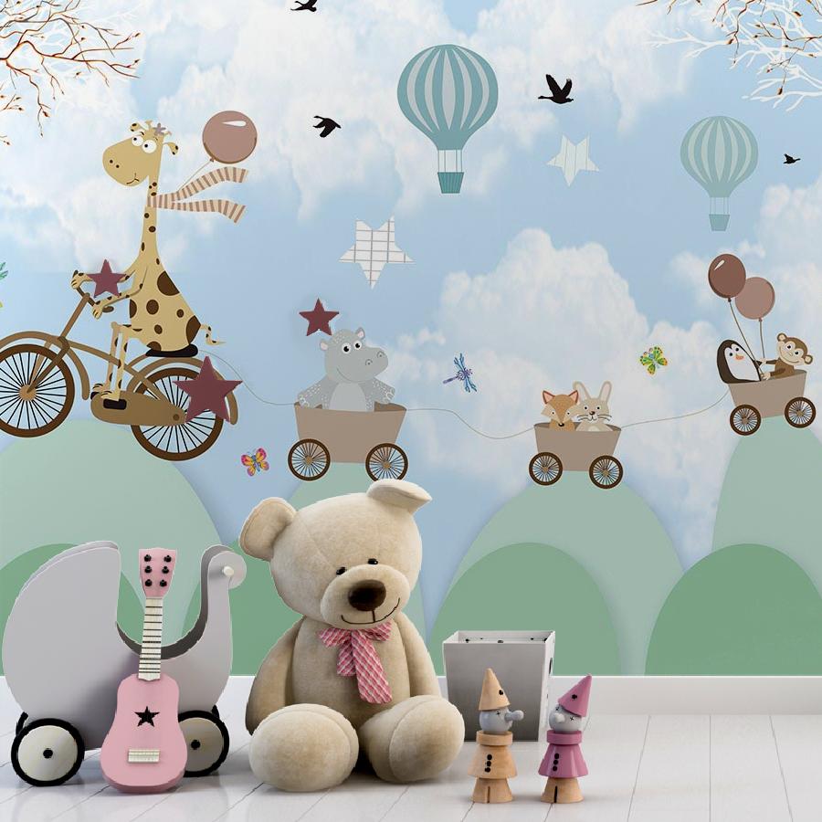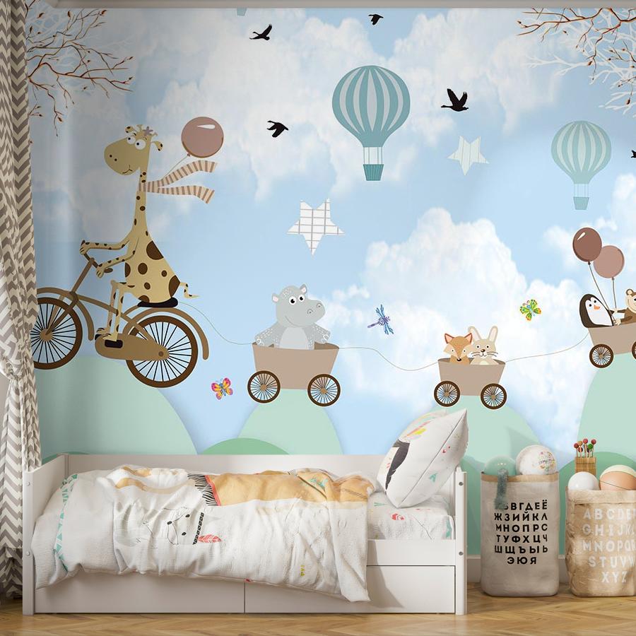 Бесшовные фотообои Жираф на велосипеде, артикул 12-1545, прекрасно подойдут к любому помещению: в гостиную, в спальню, в кухню или в детскую и украсят ваш интерьер. Купить фотообои в интернет магазине MasterFresok можно в нескольких типовых размерах: