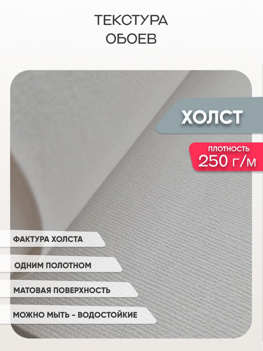Фотообои Холст: плотность 250 г/м²; толщина 0,4 мм; светостойкие ✅; защитный слой: ✅; легкий монтаж ✅; срок службы: более 10 лет; легкий рельеф; легкая влажная уборка ✅