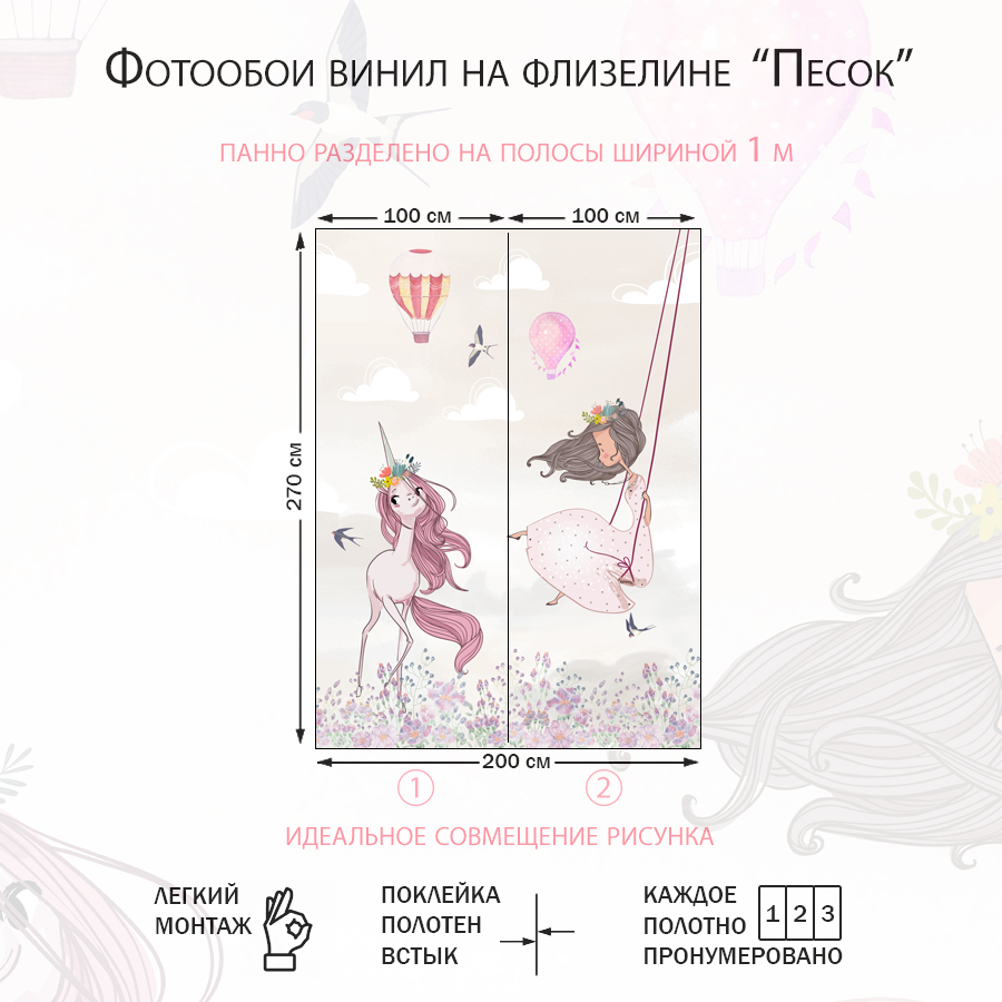 Бесшовные фотообои Единорожек с девочкой, артикул 14-442, прекрасно подойдут к любому помещению: в гостиную, в спальню, в кухню или в детскую и украсят ваш интерьер. Купить фотообои в интернет магазине MasterFresok можно в нескольких типовых размерах: