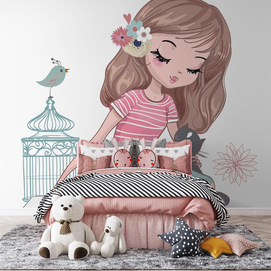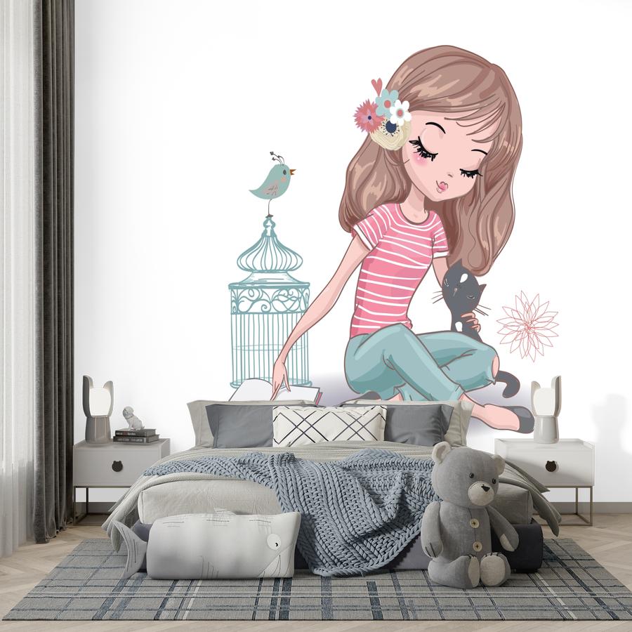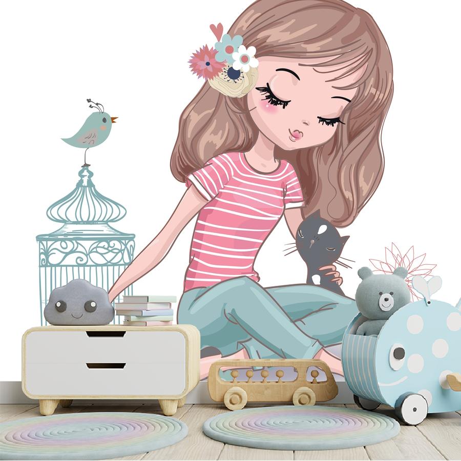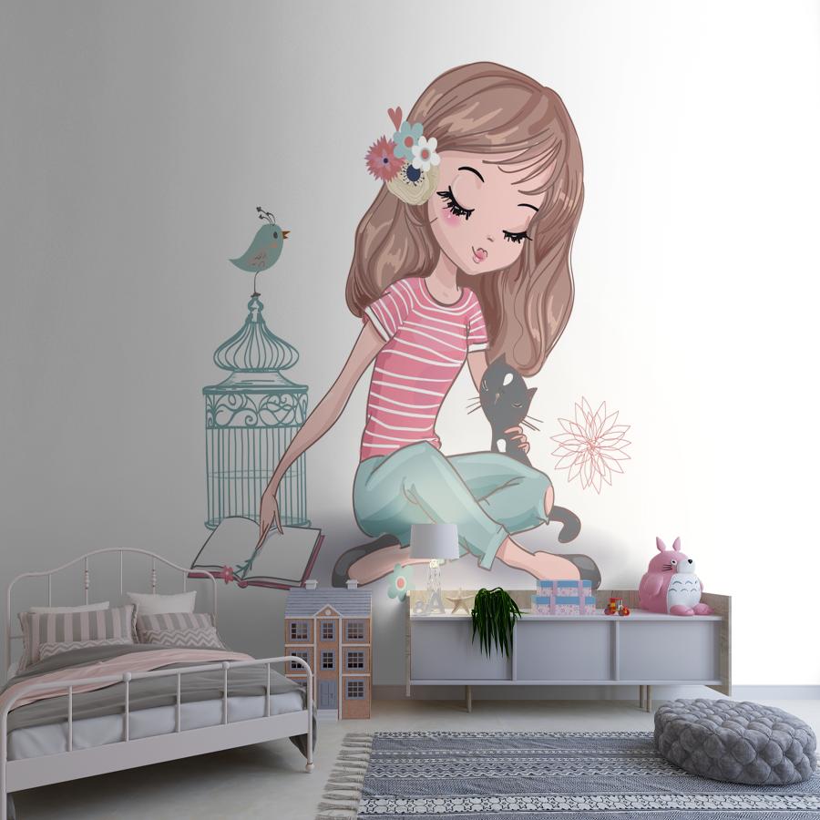 Бесшовные фотообои Девочка и кот , артикул 12-641, прекрасно подойдут к любому помещению: в гостиную, в спальню, в кухню или в детскую и украсят ваш интерьер. Купить фотообои в интернет магазине MasterFresok можно в нескольких типовых размерах: