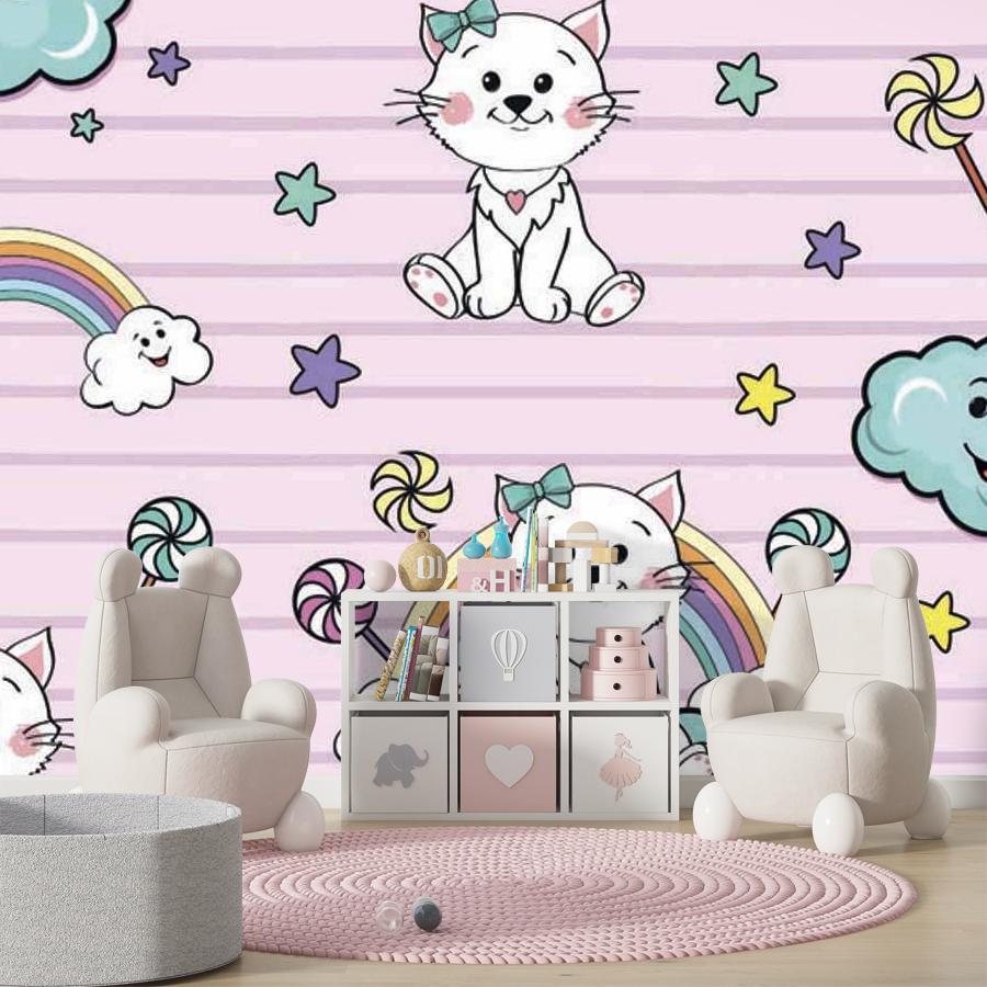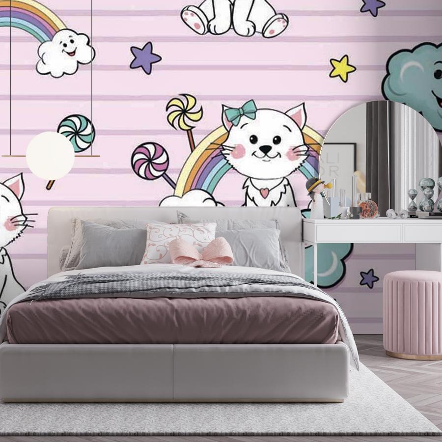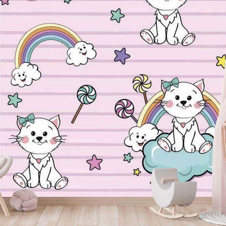 Бесшовные фотообои Котята на облаках на розовом фоне, артикул 12-414, прекрасно подойдут к любому помещению: в гостиную, в спальню, в кухню или в детскую и украсят ваш интерьер. Купить фотообои в интернет магазине MasterFresok можно в нескольких типовых размерах: