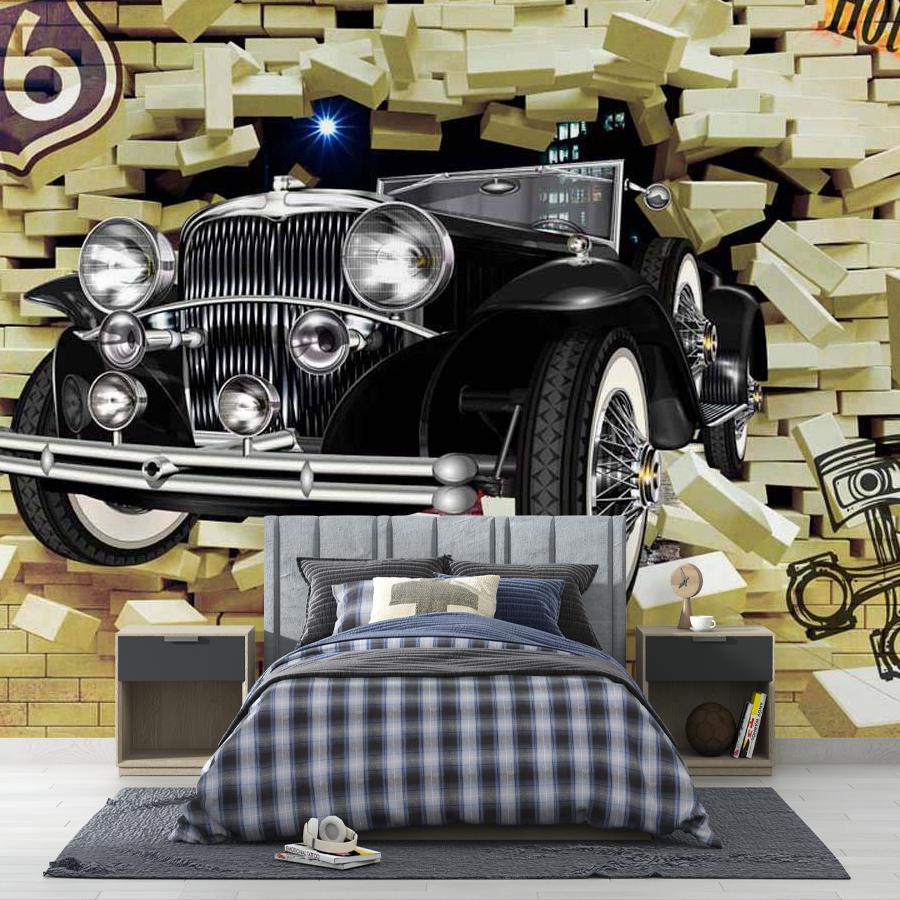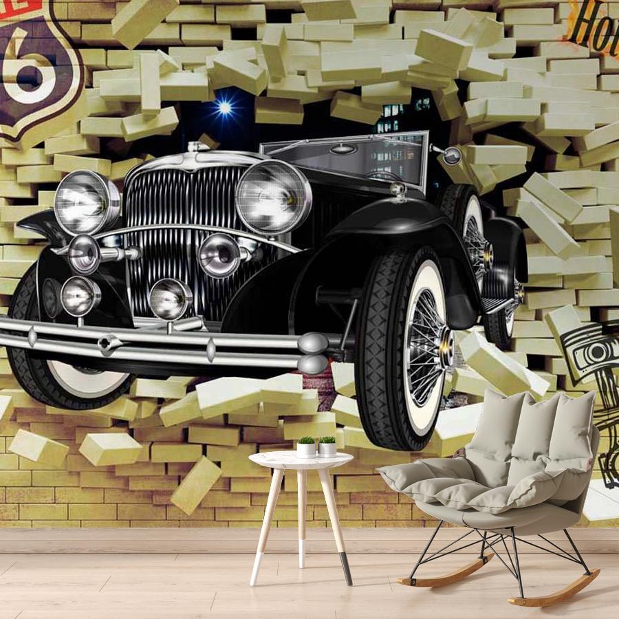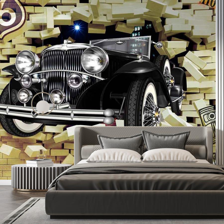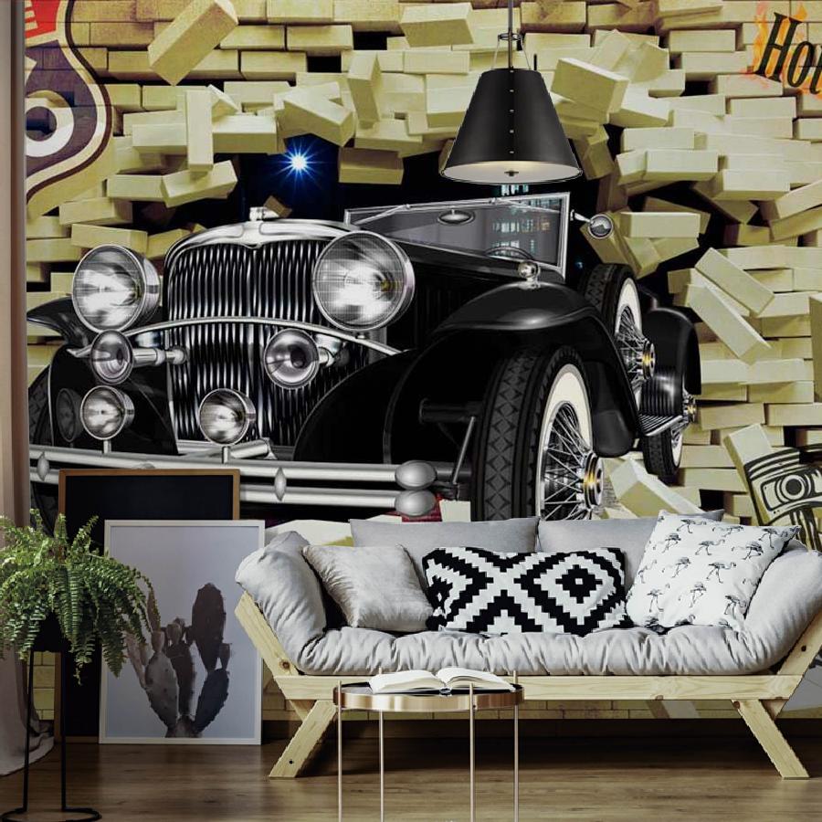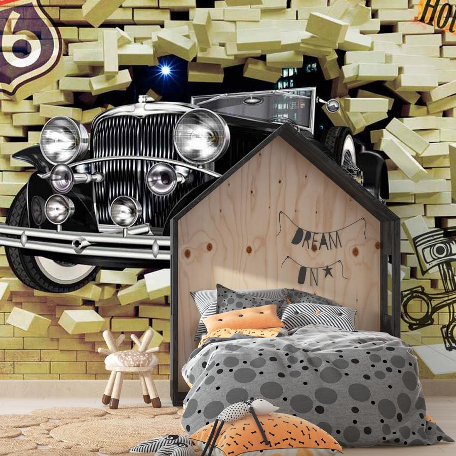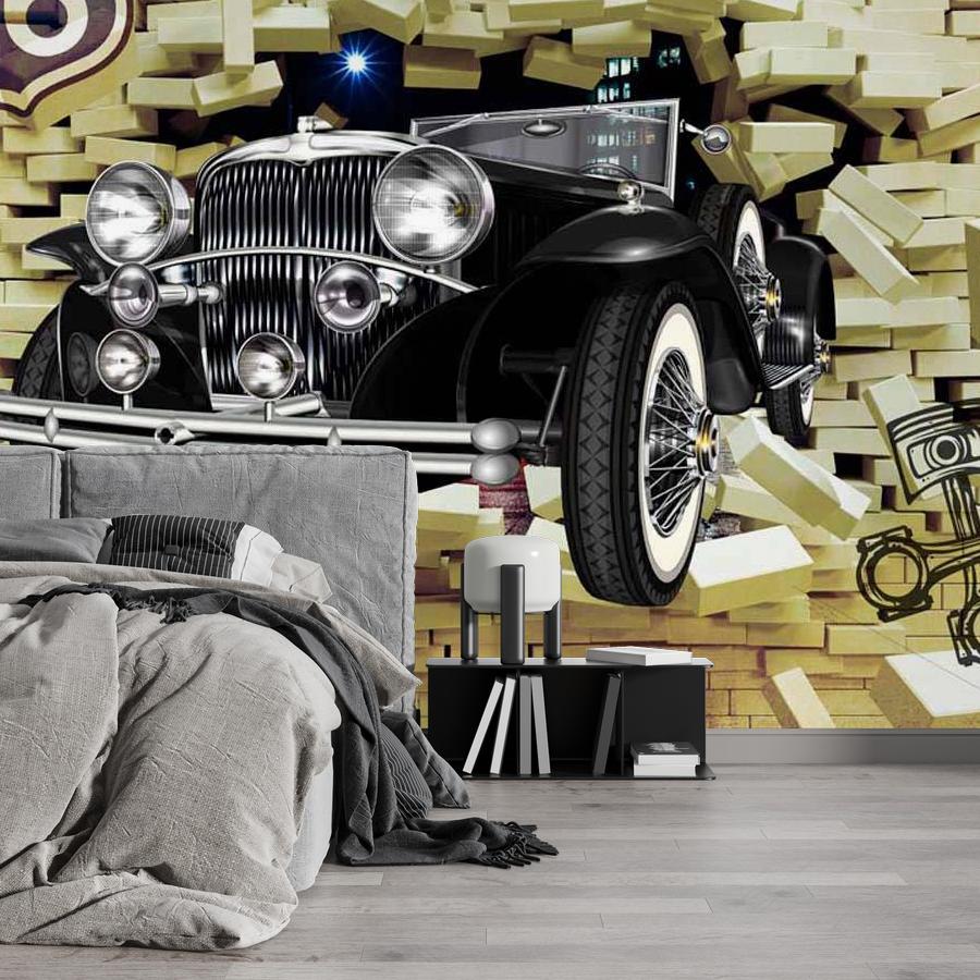 Бесшовные фотообои Ретро автомобиль выезжает из стены, артикул 12-385, прекрасно подойдут к любому помещению: в гостиную, в спальню, в кухню или в детскую и украсят ваш интерьер. Купить фотообои в интернет магазине MasterFresok можно в нескольких типовых размерах: