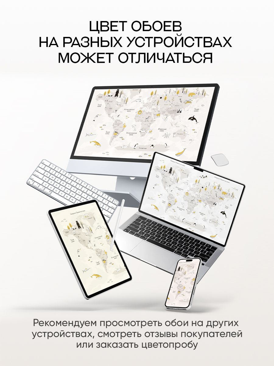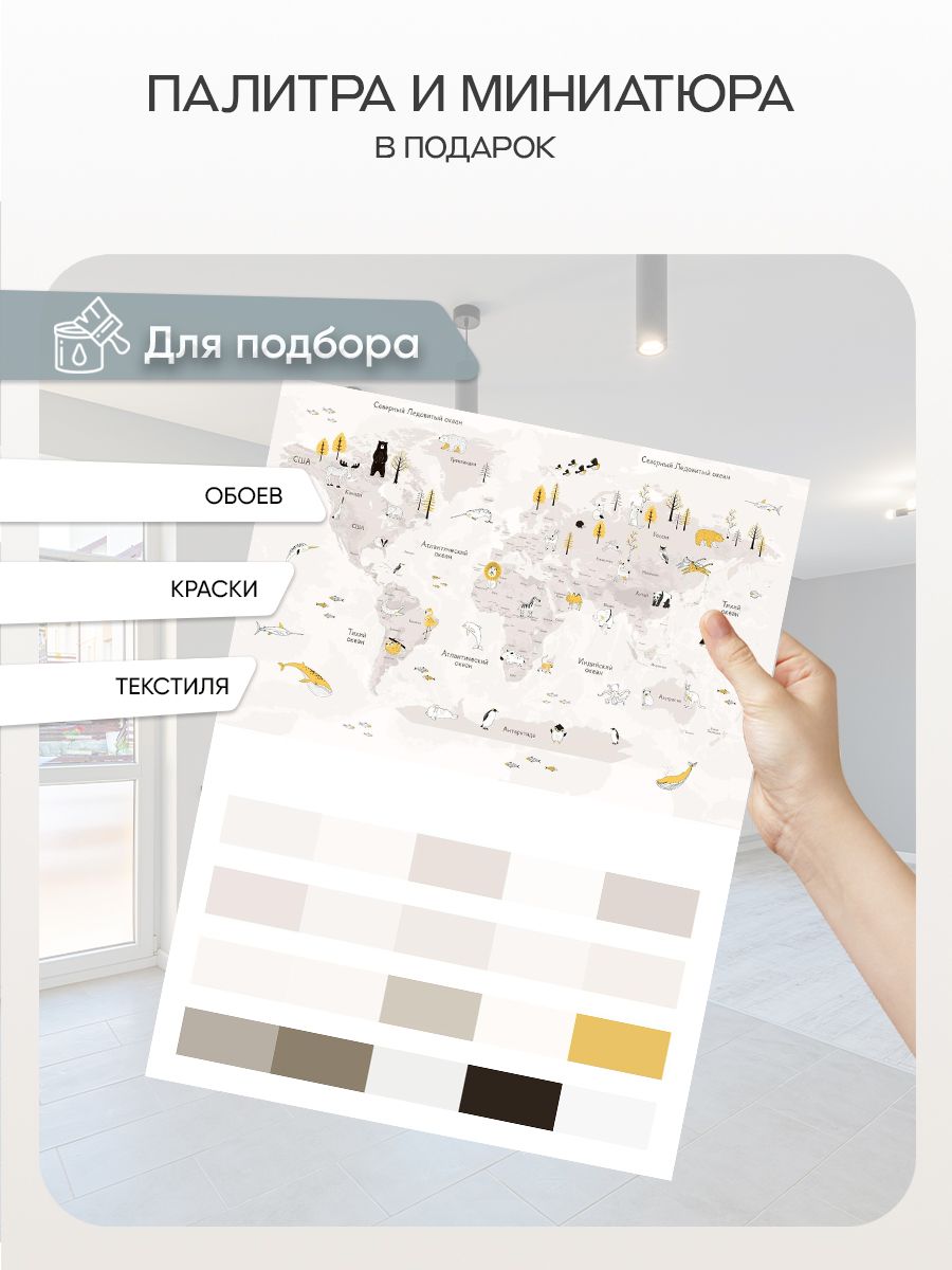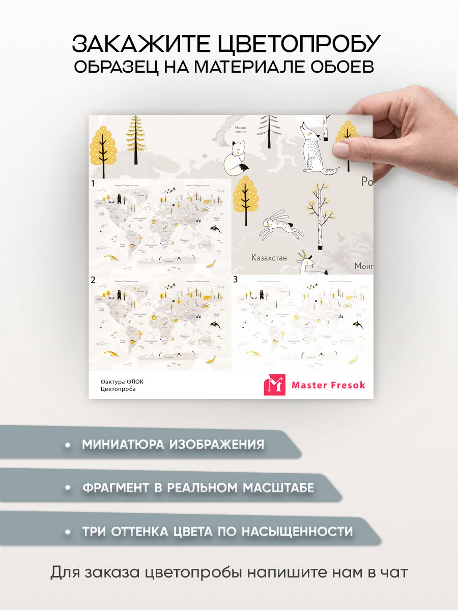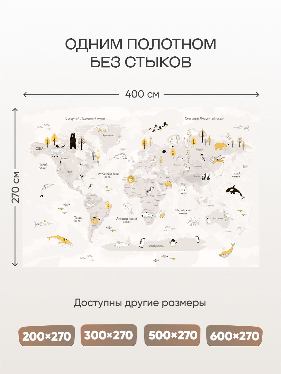 Бесшовные фотообои Карта мира с животными, артикул 12-1317, прекрасно подойдут к любому помещению: в гостиную, в спальню, в кухню или в детскую и украсят ваш интерьер. Купить фотообои в интернет магазине MasterFresok можно в нескольких типовых размерах: