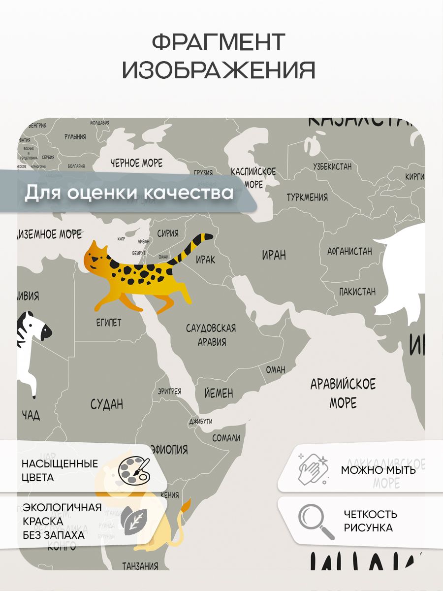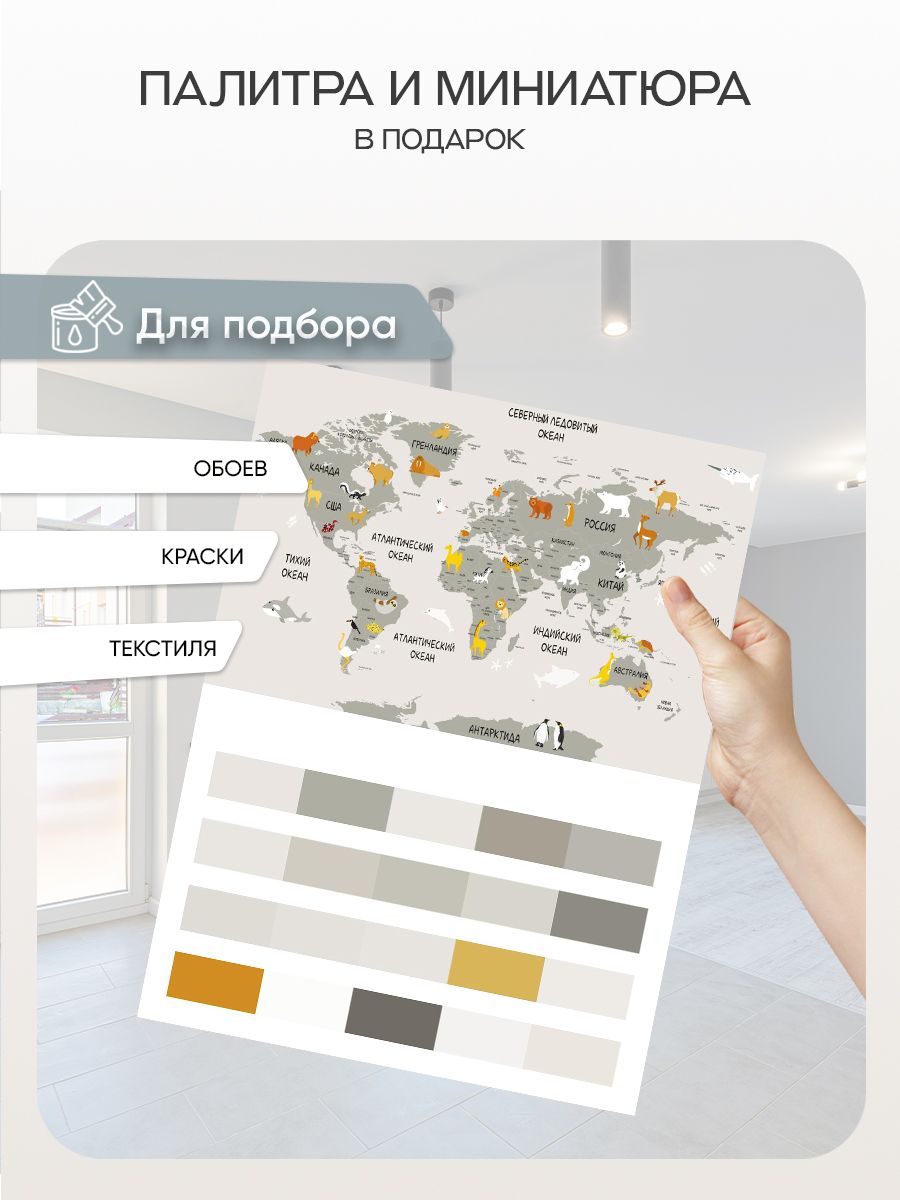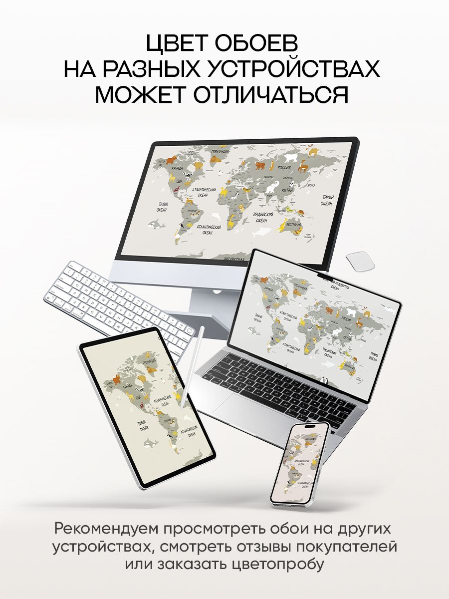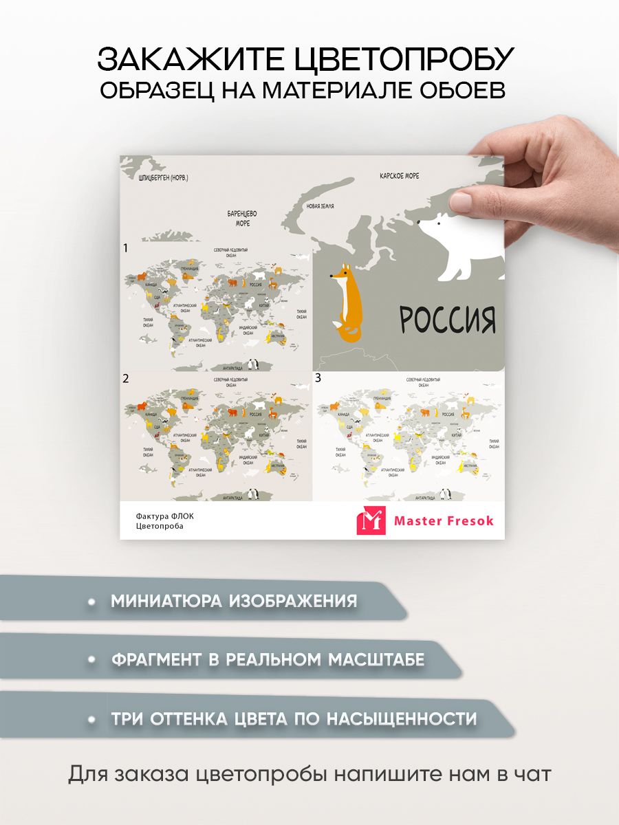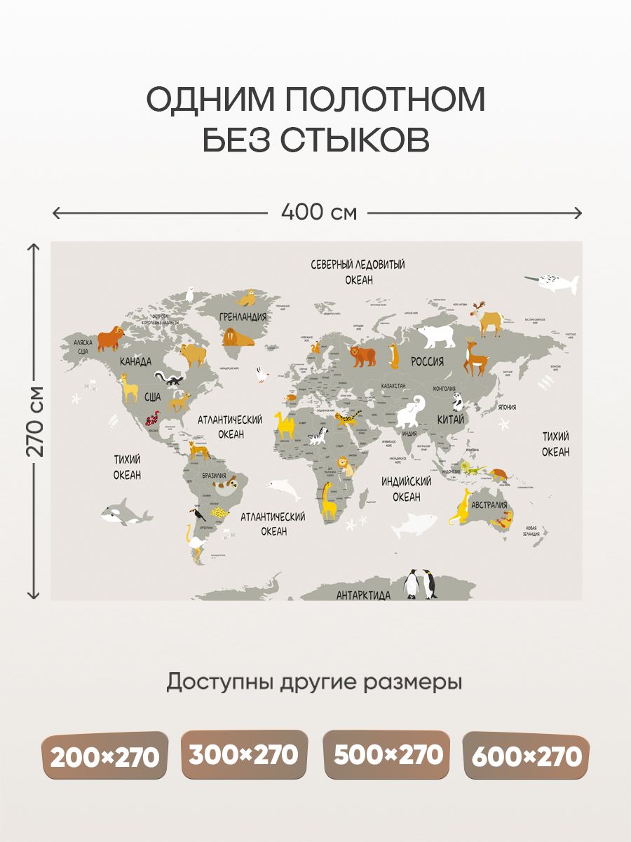 Бесшовные фотообои Карта мира с животными, артикул 14-048, прекрасно подойдут к любому помещению: в гостиную, в спальню, в кухню или в детскую и украсят ваш интерьер. Купить фотообои в интернет магазине MasterFresok можно в нескольких типовых размерах: