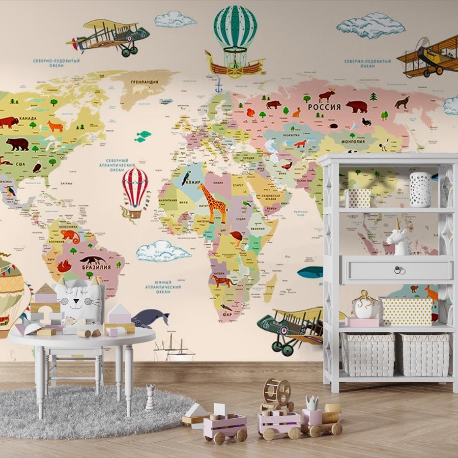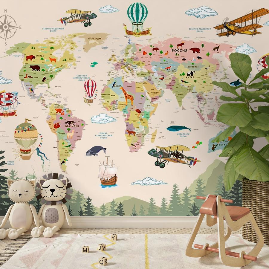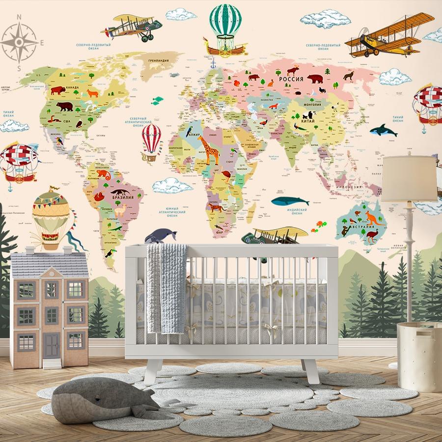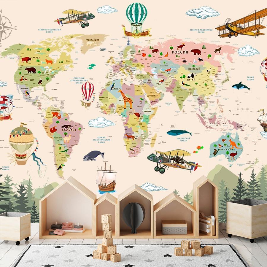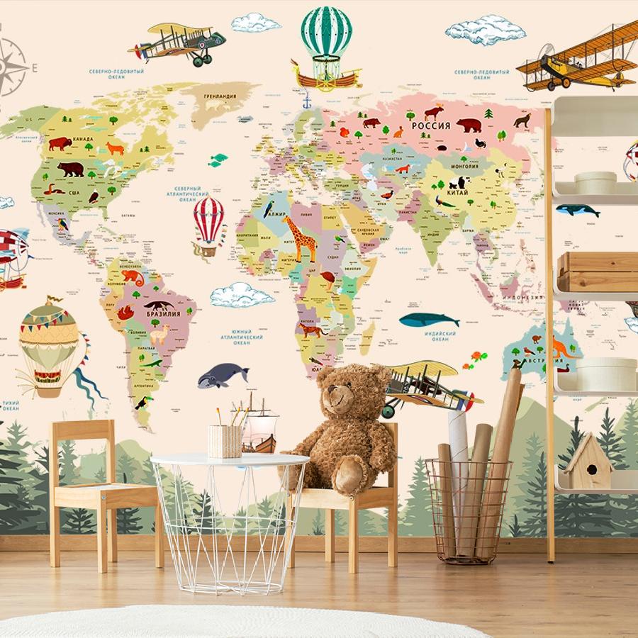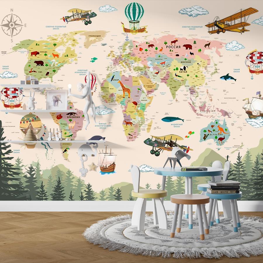 Бесшовные фотообои Карта мира и лес , артикул 14-537, прекрасно подойдут к любому помещению: в гостиную, в спальню, в кухню или в детскую и украсят ваш интерьер. Купить фотообои в интернет магазине MasterFresok можно в нескольких типовых размерах:
