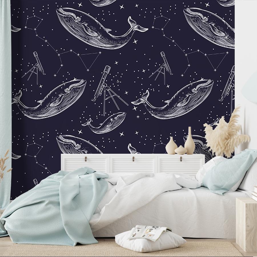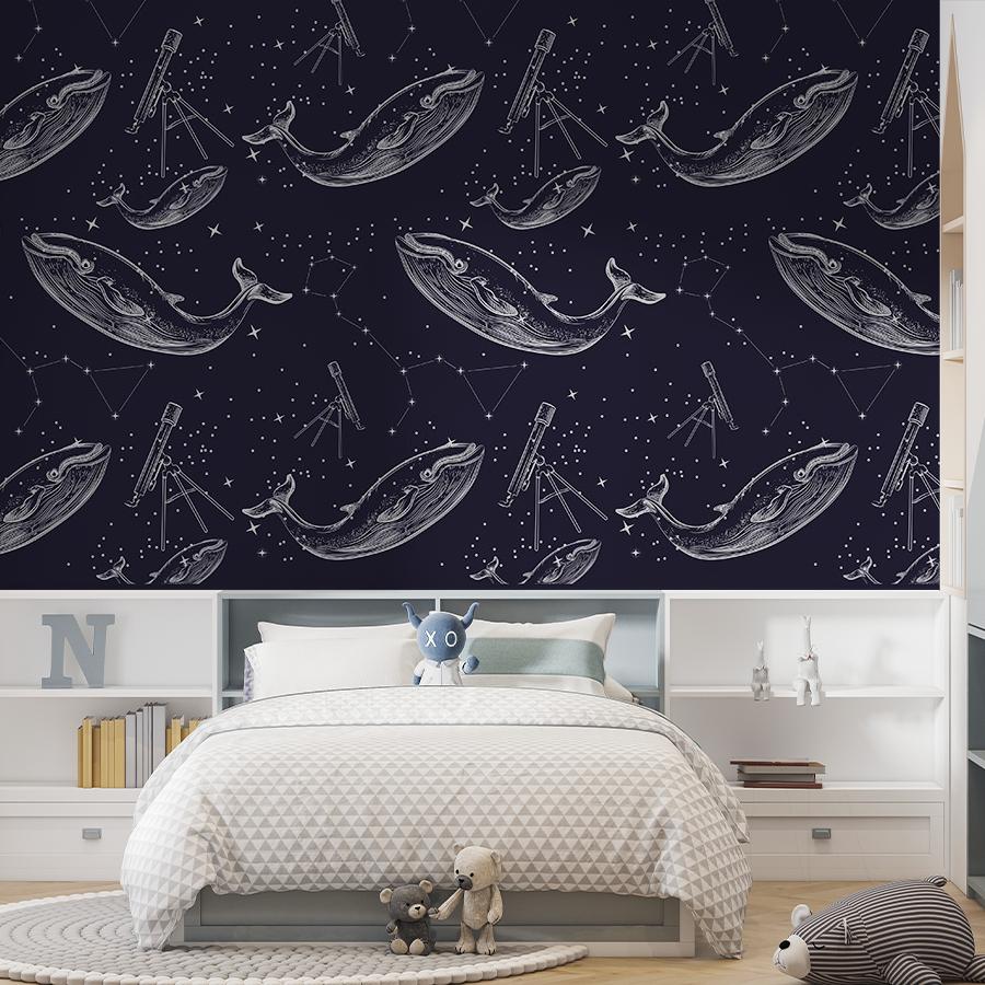 Бесшовные фотообои Киты на темном фоне, артикул 14-760, прекрасно подойдут к любому помещению: в гостиную, в спальню, в кухню или в детскую и украсят ваш интерьер. Купить фотообои в интернет магазине MasterFresok можно в нескольких типовых размерах: