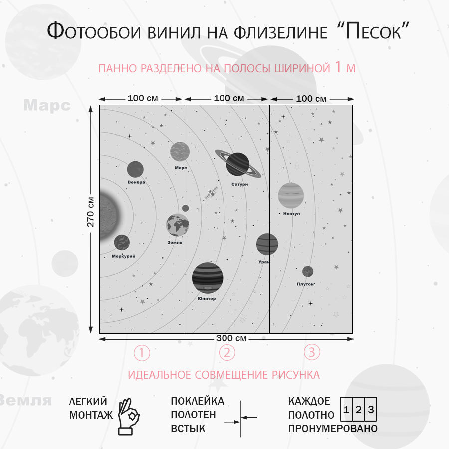 Бесшовные фотообои Solar System, артикул 13-212, прекрасно подойдут к любому помещению: в гостиную, в спальню, в кухню или в детскую и украсят ваш интерьер. Купить фотообои в интернет магазине MasterFresok можно в нескольких типовых размерах:
