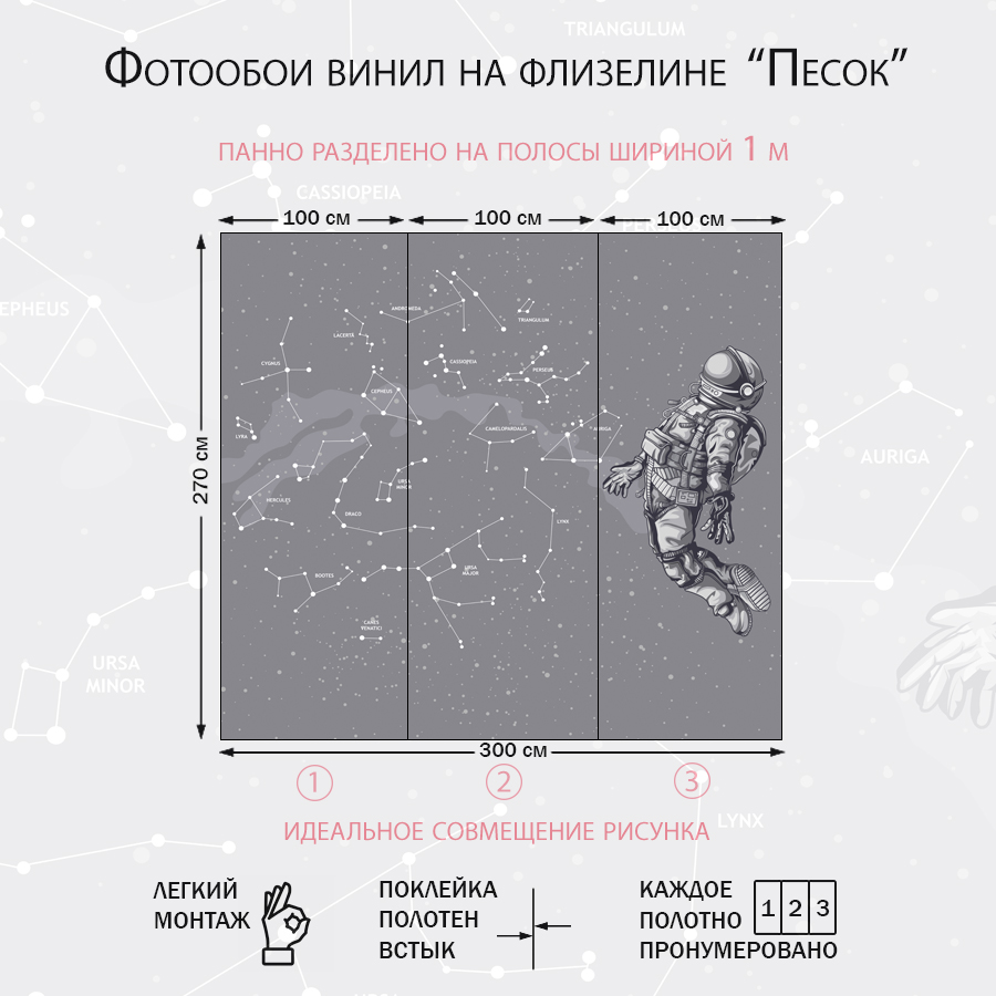 Бесшовные фотообои Космонавт , артикул 14-430, прекрасно подойдут к любому помещению: в гостиную, в спальню, в кухню или в детскую и украсят ваш интерьер. Купить фотообои в интернет магазине MasterFresok можно в нескольких типовых размерах: