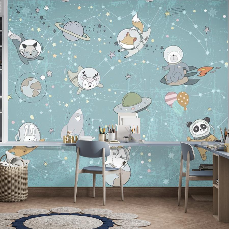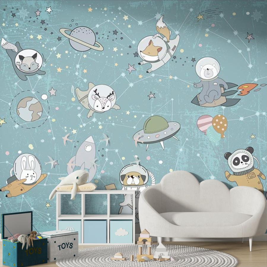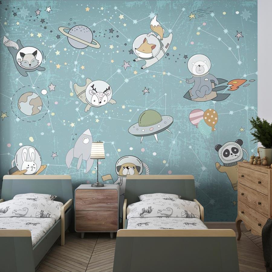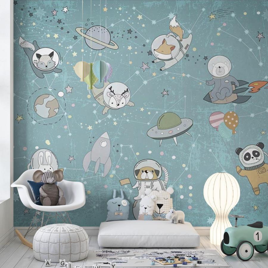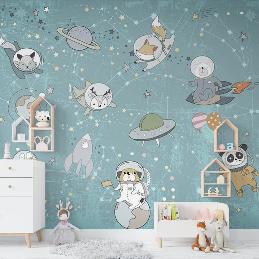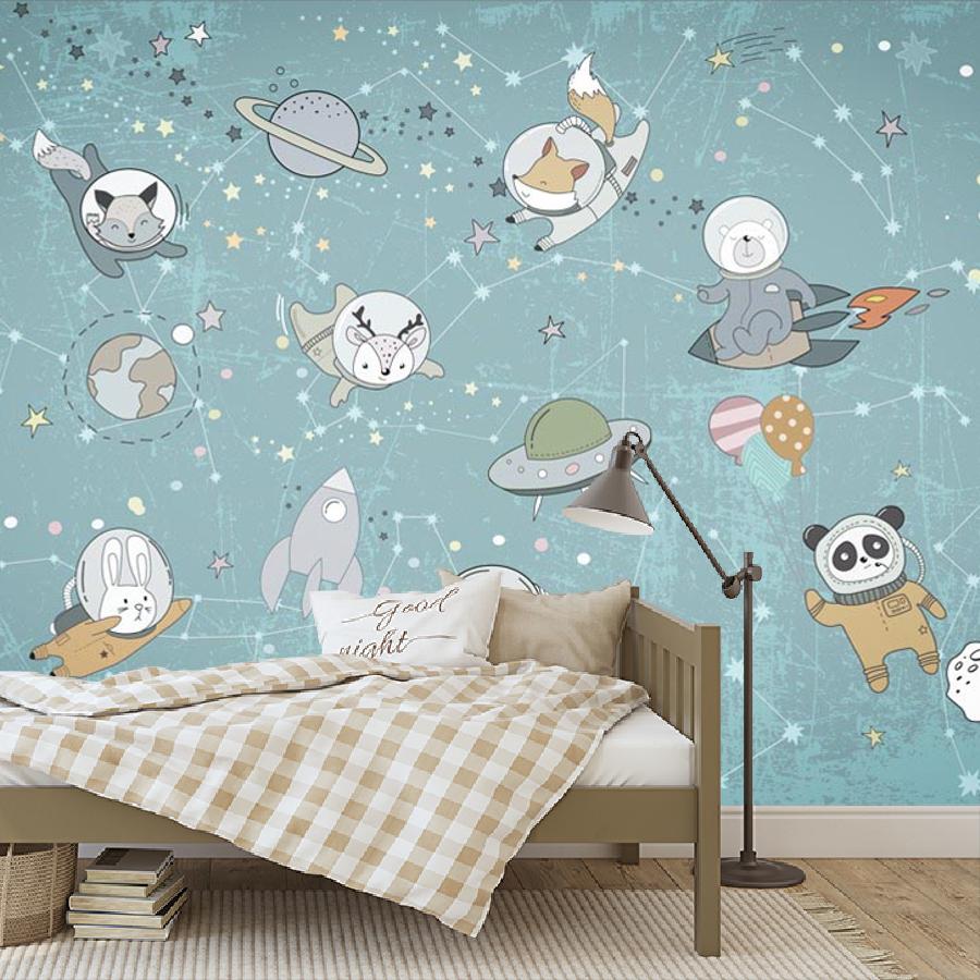 Бесшовные фотообои Космос детский с животными, артикул 14-669, прекрасно подойдут к любому помещению: в гостиную, в спальню, в кухню или в детскую и украсят ваш интерьер. Купить фотообои в интернет магазине MasterFresok можно в нескольких типовых размерах: