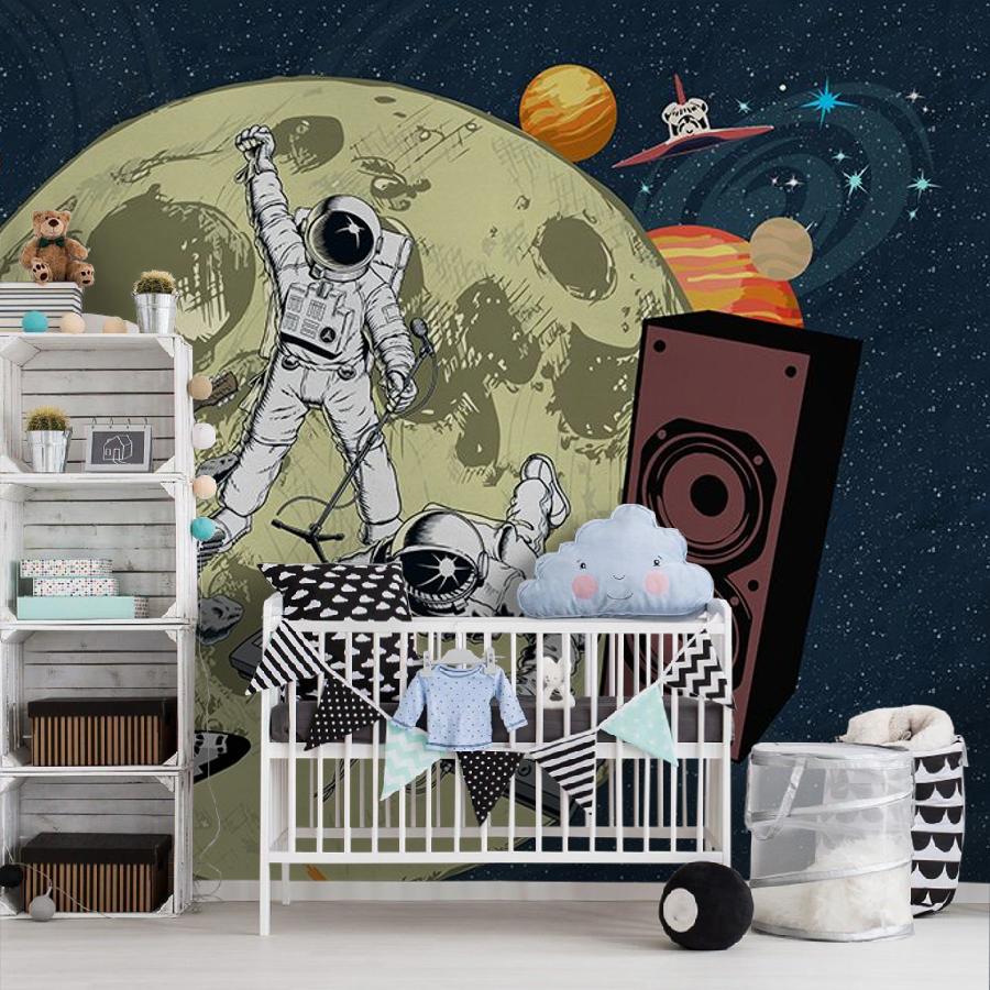 Бесшовные фотообои В детскую: музыкальная группа в космосе, артикул 14-729, прекрасно подойдут к любому помещению: в гостиную, в спальню, в кухню или в детскую и украсят ваш интерьер. Купить фотообои в интернет магазине MasterFresok можно в нескольких типовых размерах: