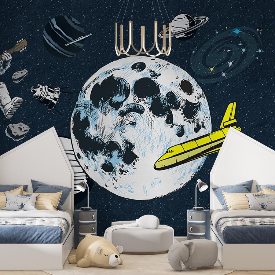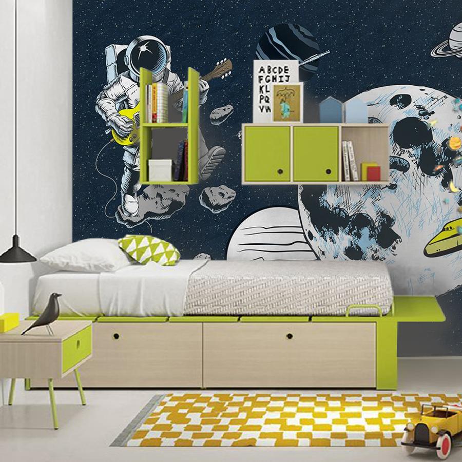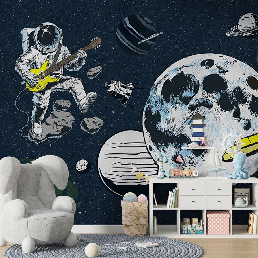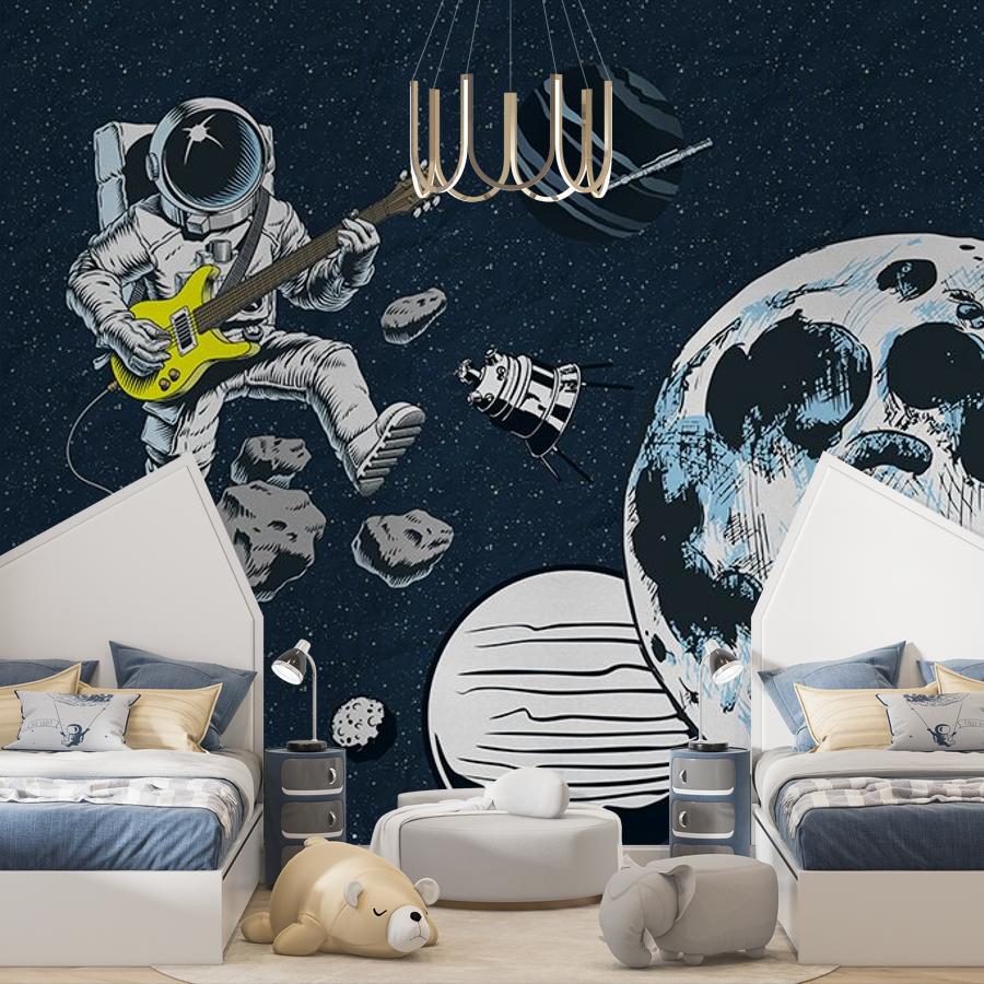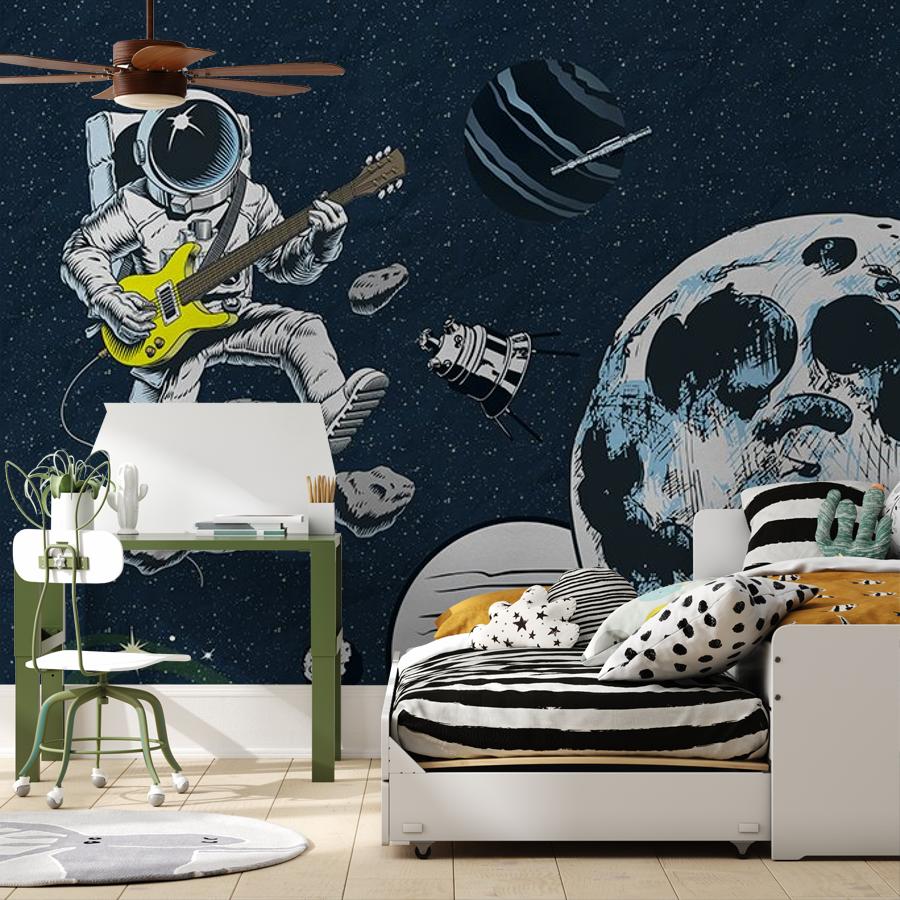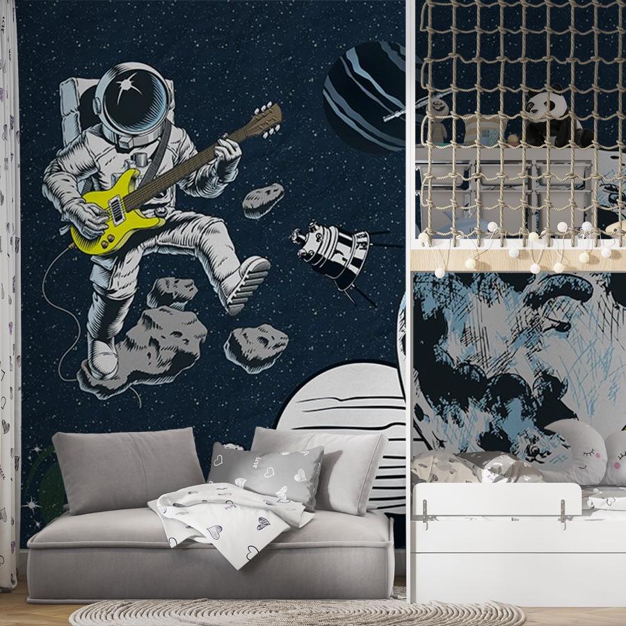 Бесшовные фотообои в детскую: Космонавт-гитарист., артикул 14-736, прекрасно подойдут к любому помещению: в гостиную, в спальню, в кухню или в детскую и украсят ваш интерьер. Купить фотообои в интернет магазине MasterFresok можно в нескольких типовых размерах: