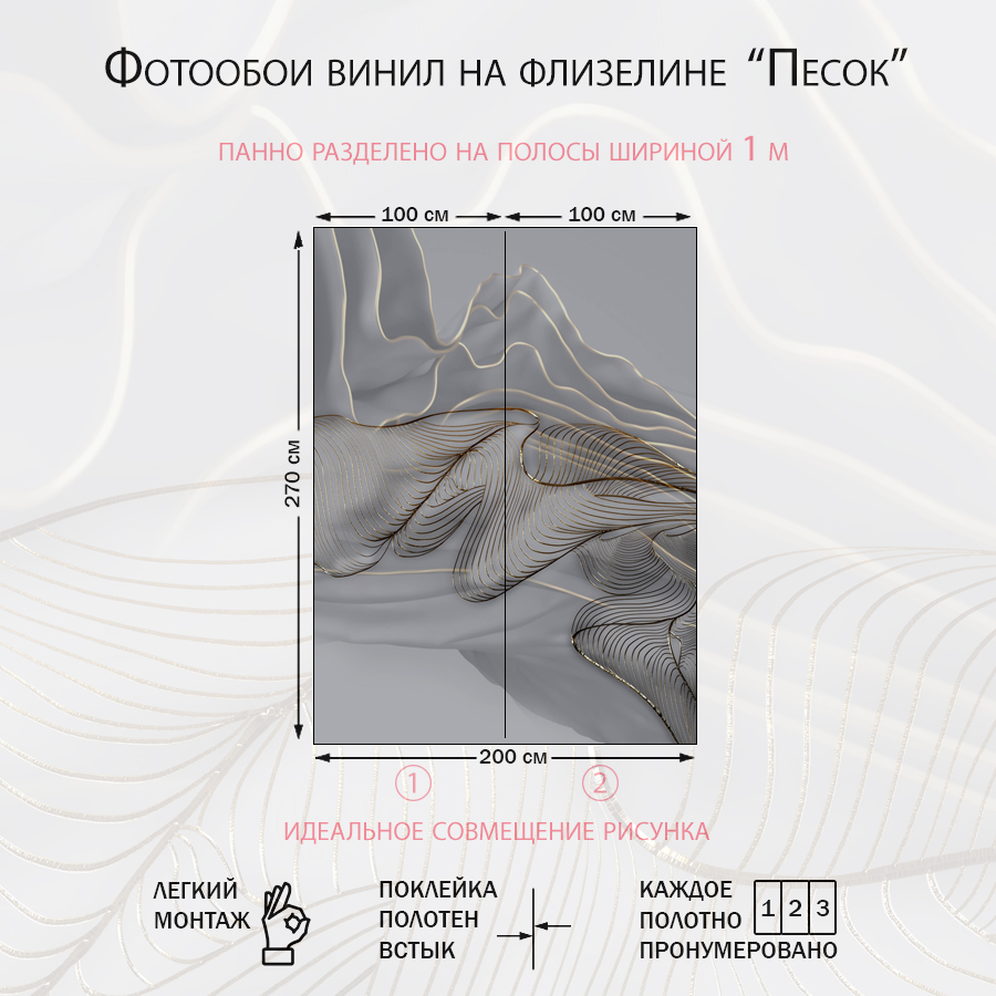 Фотообои Песок: плотность 200 г/м²; толщина 0,3 мм; светостойкие ✅; ширина полос 1м ✅; легкий монтаж ✅; срок службы: более 5 лет; легкий рельеф песка; легкая влажная уборка ✅