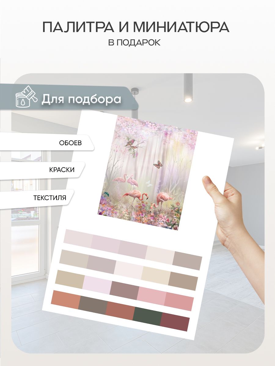 Бесшовные фотообои Розовый фламинго в утреннем лесу , артикул 7-363, прекрасно подойдут к любому помещению: в гостиную, в спальню, в кухню или в детскую и украсят ваш интерьер. Купить фотообои в интернет магазине MasterFresok можно в нескольких типовых размерах: