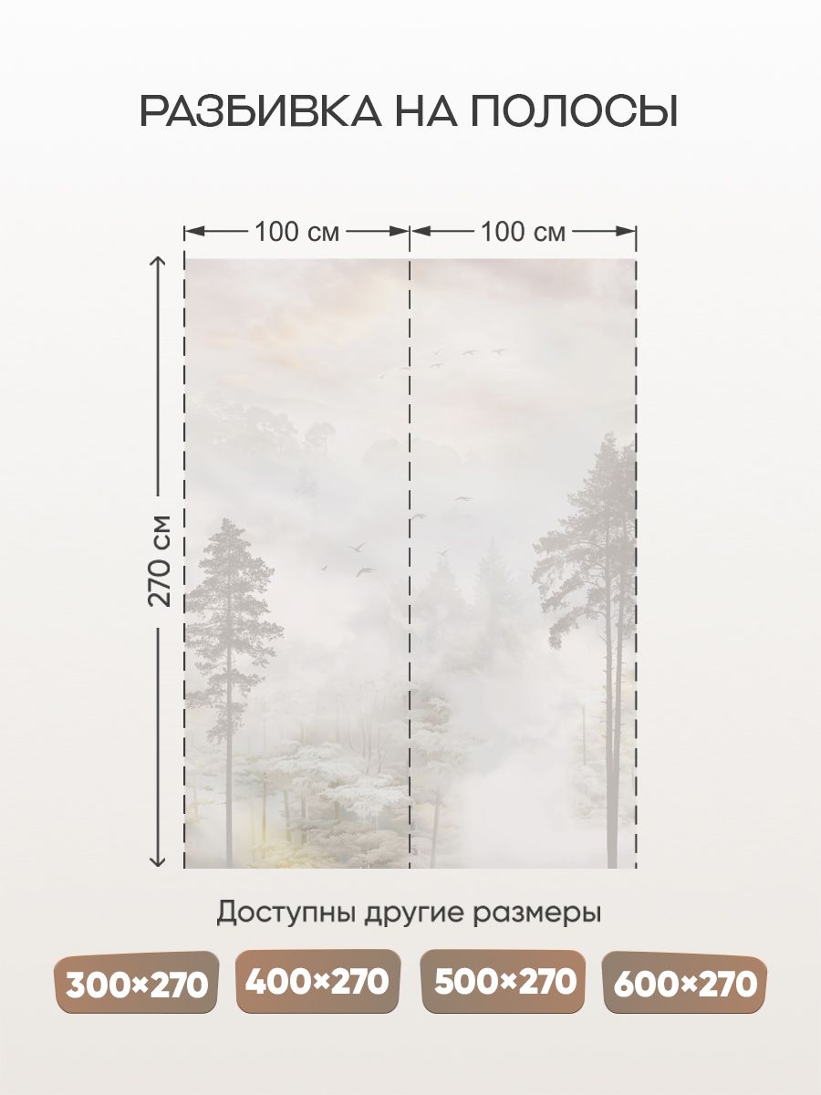 Бесшовные фотообои Деревья в тумане на рассвете, артикул 13-903, прекрасно подойдут к любому помещению: в гостиную, в спальню, в кухню или в детскую и украсят ваш интерьер. Купить фотообои в интернет магазине MasterFresok можно в нескольких типовых размерах: