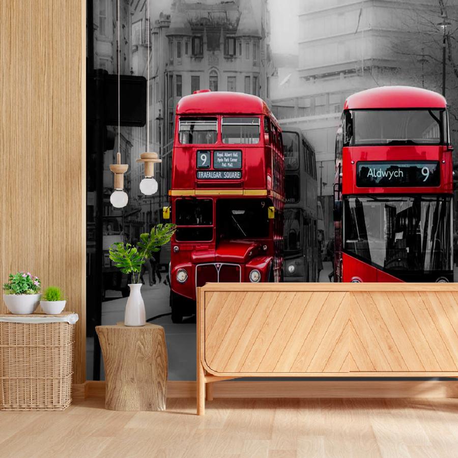 Бесшовные фотообои Два красных автобуса на улице Лондона, артикул 9-541, прекрасно подойдут к любому помещению: в гостиную, в спальню, в кухню или в детскую и украсят ваш интерьер. Купить фотообои в интернет магазине MasterFresok можно в нескольких типовых размерах: