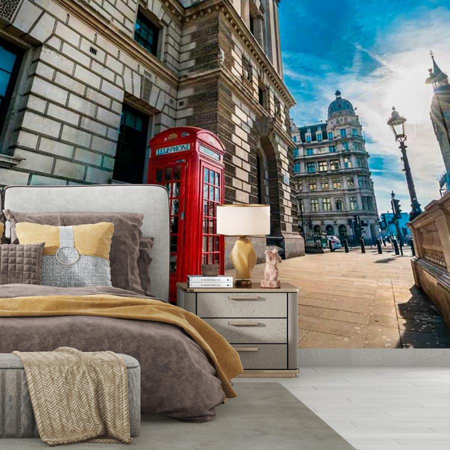Бесшовные фотообои Телефонная будка солнечного Лондона, артикул 9-572, прекрасно подойдут к любому помещению: в гостиную, в спальню, в кухню или в детскую и украсят ваш интерьер. Купить фотообои в интернет магазине MasterFresok можно в нескольких типовых размерах: