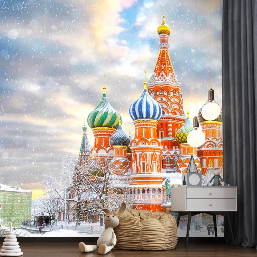 Бесшовные фотообои Зимний вид на собор Василия Блаженного, артикул 9-416, прекрасно подойдут к любому помещению: в гостиную, в спальню, в кухню или в детскую и украсят ваш интерьер. Купить фотообои в интернет магазине MasterFresok можно в нескольких типовых размерах: