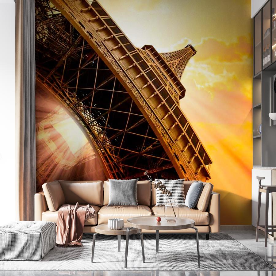 Бесшовные фотообои Вид на эйфелеву башню снизу во время заката, артикул 9-765, прекрасно подойдут к любому помещению: в гостиную, в спальню, в кухню или в детскую и украсят ваш интерьер. Купить фотообои в интернет магазине MasterFresok можно в нескольких типовых размерах: