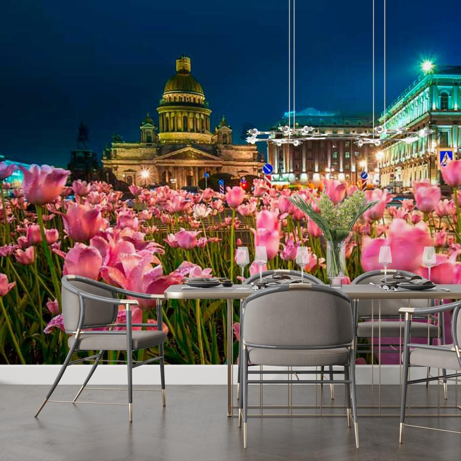 Фотообои Розовые тюльпаны у Исаакиевского собора 9-663-S-Холст