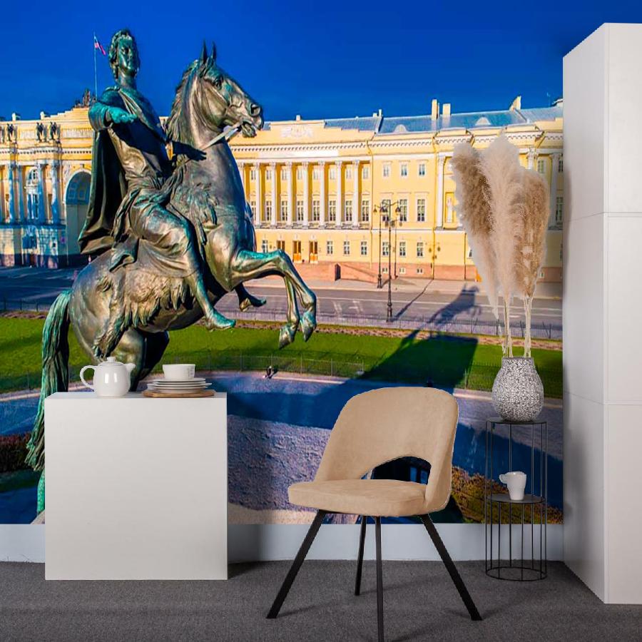 Бесшовные фотообои Медный всадник, артикул 9-669, прекрасно подойдут к любому помещению: в гостиную, в спальню, в кухню или в детскую и украсят ваш интерьер. Купить фотообои в интернет магазине MasterFresok можно в нескольких типовых размерах: