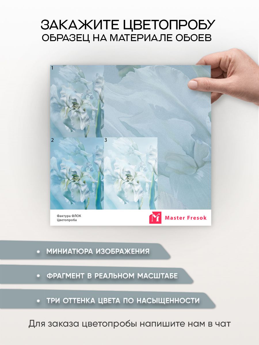 Бесшовные фотообои Голубые ирисы , артикул 13-179, прекрасно подойдут к любому помещению: в гостиную, в спальню, в кухню или в детскую и украсят ваш интерьер. Купить фотообои в интернет магазине MasterFresok можно в нескольких типовых размерах: