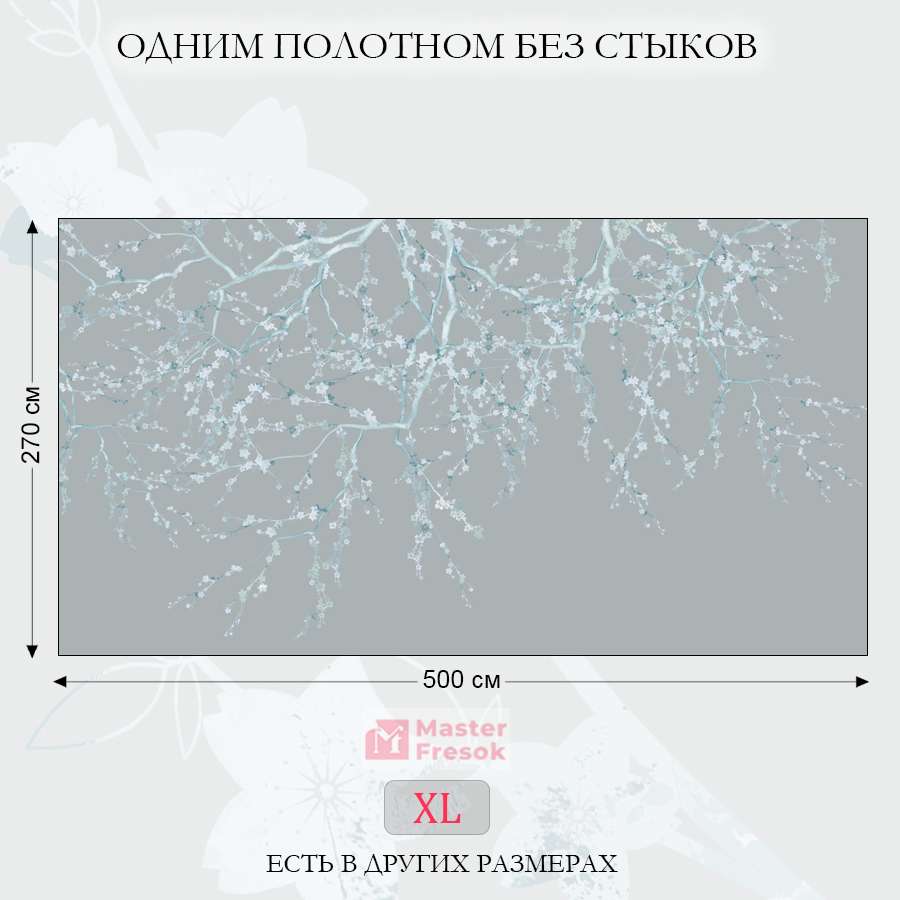 Бесшовные фотообои Голубая сакура , артикул 13-415, прекрасно подойдут к любому помещению: в гостиную, в спальню, в кухню или в детскую и украсят ваш интерьер. Купить фотообои в интернет магазине MasterFresok можно в нескольких типовых размерах:
