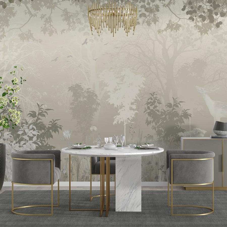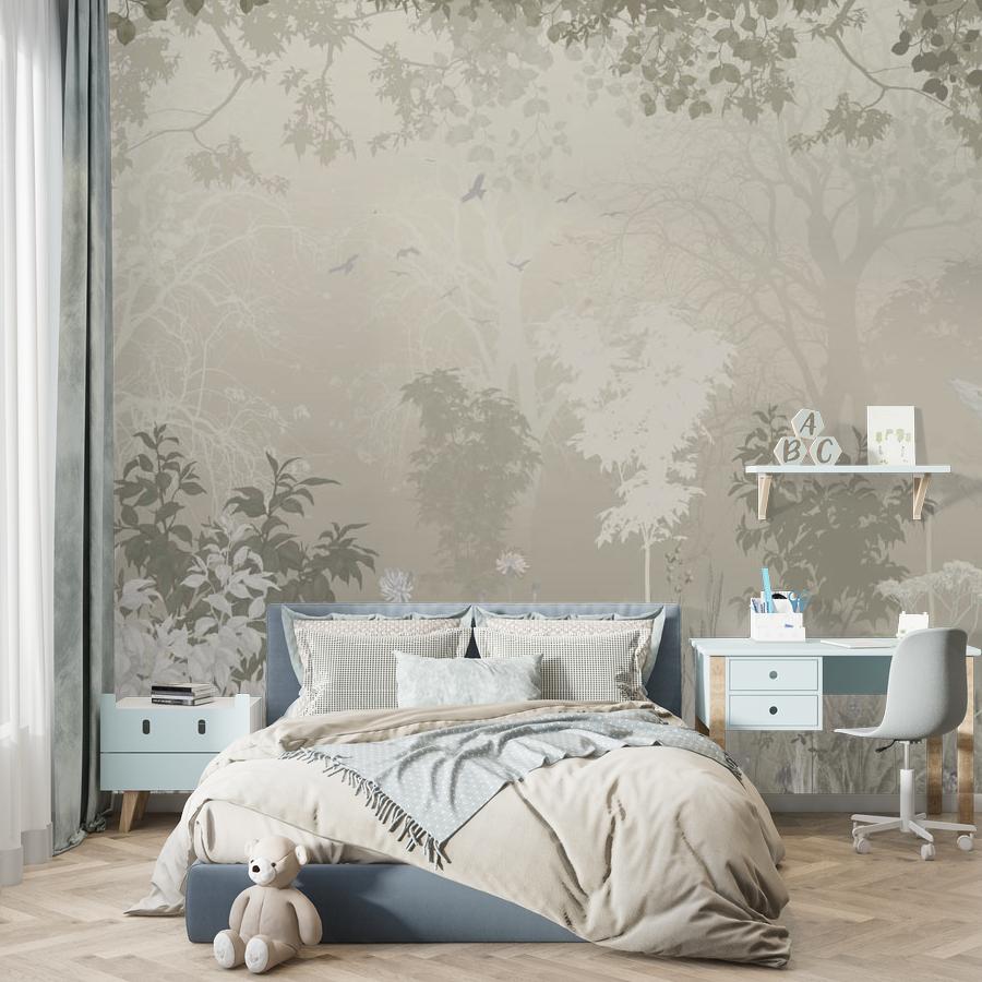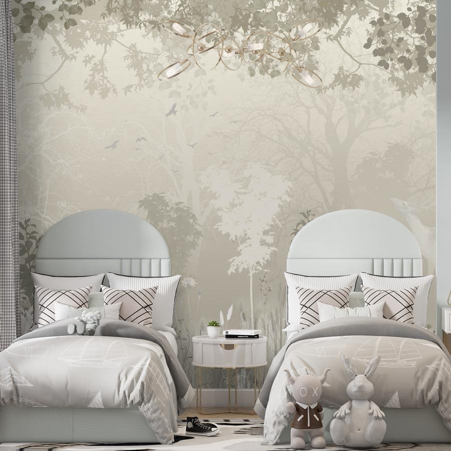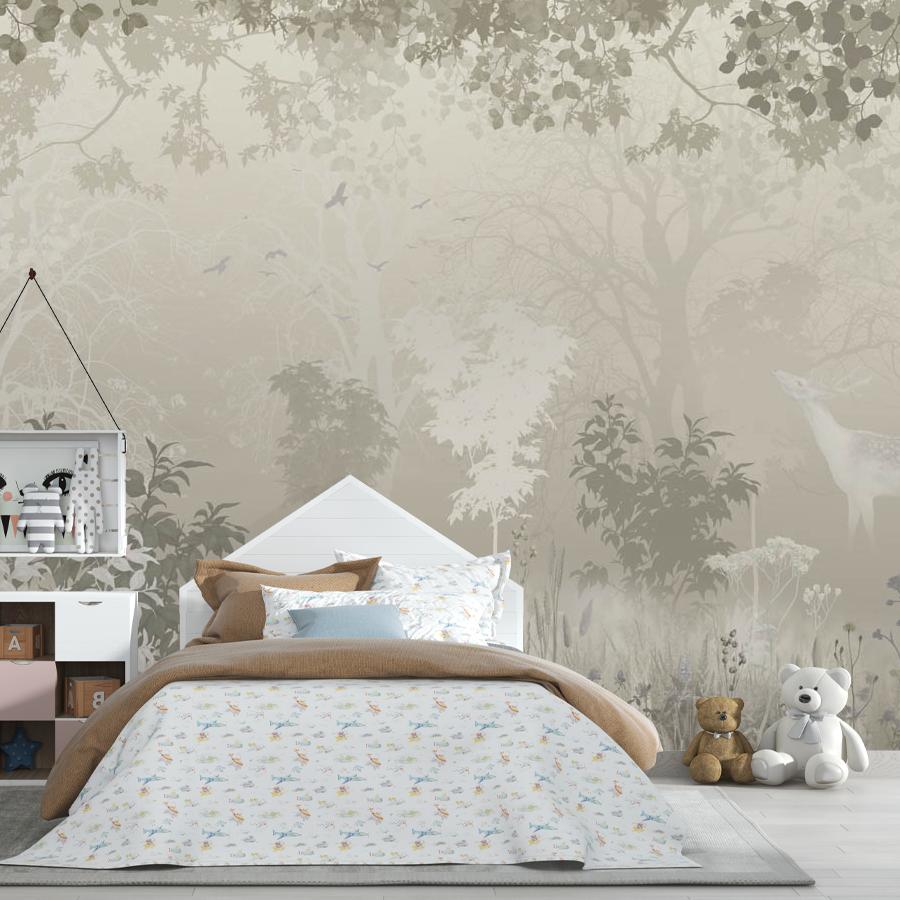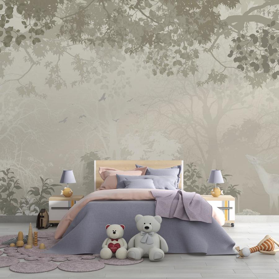 Бесшовные фотообои в спальню Лес с оленем, артикул 13-683, прекрасно подойдут к любому помещению: в гостиную, в спальню, в кухню или в детскую и украсят ваш интерьер. Купить фотообои в интернет магазине MasterFresok можно в нескольких типовых размерах: