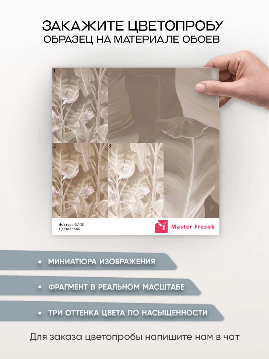 Бесшовные фотообои в гостиную Тропические листья бежевый фон, артикул 13-666, прекрасно подойдут к любому помещению: в гостиную, в спальню, в кухню или в детскую и украсят ваш интерьер. Купить фотообои в интернет магазине MasterFresok можно в нескольких типовых размерах: