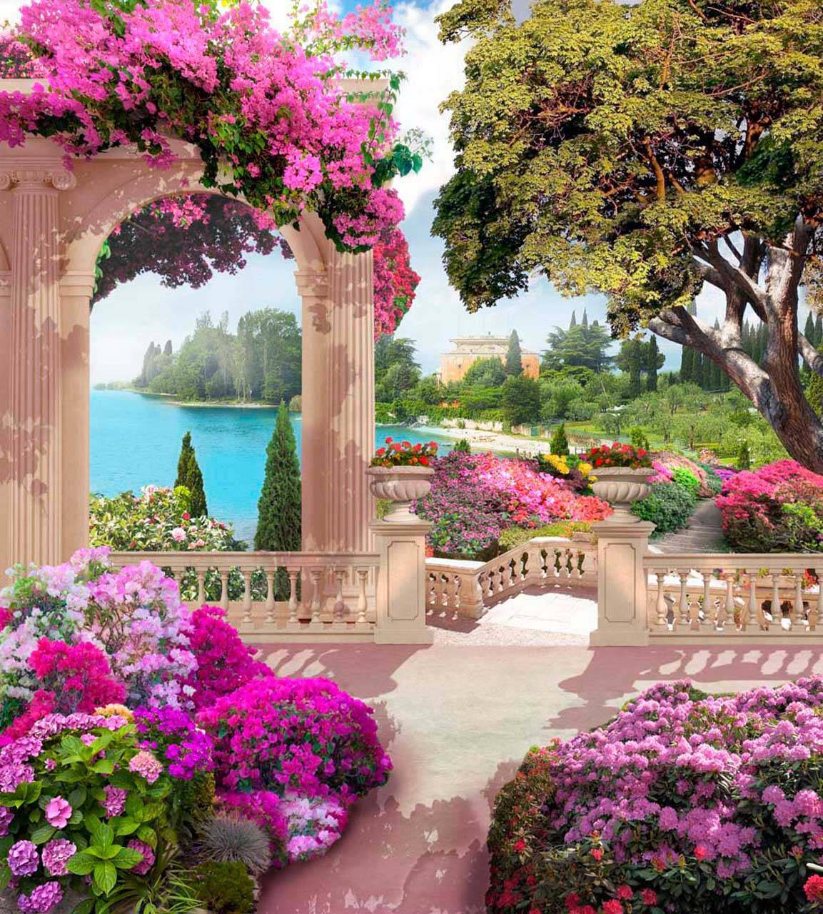 Бесшовные фотообои Терраса с розовыми цветами, артикул 7-125, прекрасно подойдут к любому помещению: в гостиную, в спальню, в кухню или в детскую и украсят ваш интерьер. Купить фотообои в интернет магазине MasterFresok можно в нескольких типовых размерах: