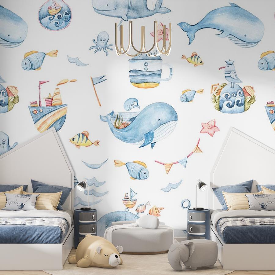 Бесшовные фотообои Киты и кораблики, артикул 12-727, прекрасно подойдут к любому помещению: в гостиную, в спальню, в кухню или в детскую и украсят ваш интерьер. Купить фотообои в интернет магазине MasterFresok можно в нескольких типовых размерах:
