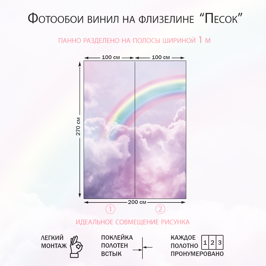Бесшовные фотообои Радуга в облаках, артикул 14-358, прекрасно подойдут к любому помещению: в гостиную, в спальню, в кухню или в детскую и украсят ваш интерьер. Купить фотообои в интернет магазине MasterFresok можно в нескольких типовых размерах: