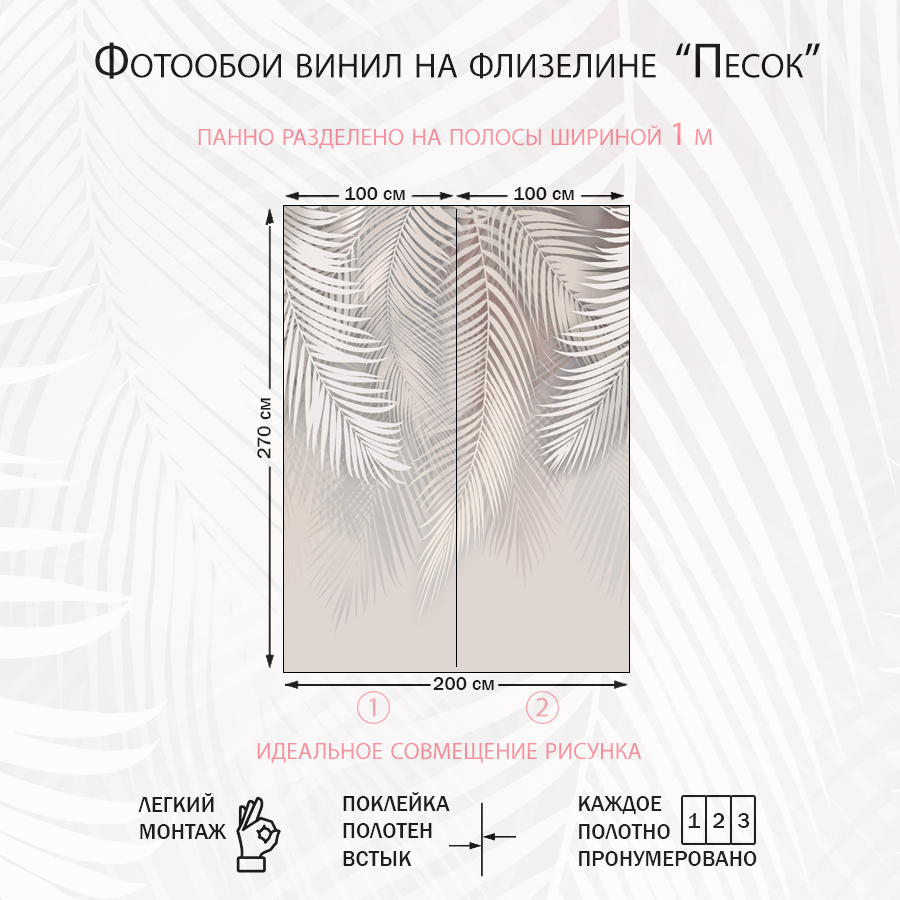 Фотообои Песок: плотность 200 г/м²; толщина 0,3 мм; светостойкие ✅; ширина полос 1м ✅; легкий монтаж ✅; срок службы: более 5 лет; легкий рельеф песка; легкая влажная уборка ✅
