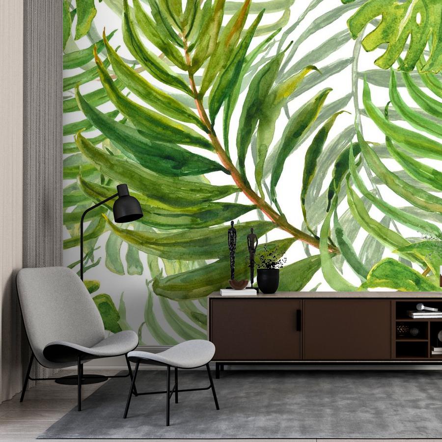 Бесшовные фотообои Фон с тропическими листьями, артикул 9-1213, прекрасно подойдут к любому помещению: в гостиную, в спальню, в кухню или в детскую и украсят ваш интерьер. Купить фотообои в интернет магазине MasterFresok можно в нескольких типовых размерах: