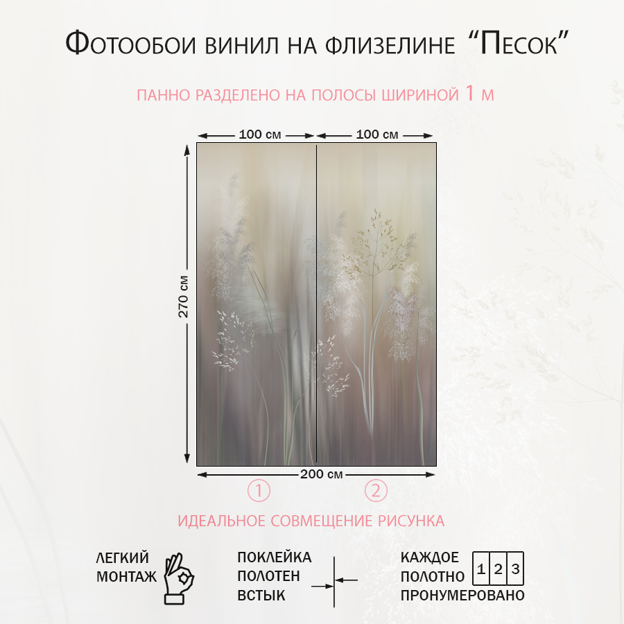 Фотообои Песок: плотность 200 г/м²; толщина 0,3 мм; светостойкие ✅; ширина полос 1м ✅; легкий монтаж ✅; срок службы: более 5 лет; легкий рельеф песка; легкая влажная уборка ✅