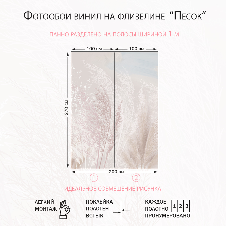 Фотообои Песок: плотность 200 г/м²; толщина 0,3 мм; светостойкие ✅; ширина полос 1м ✅; легкий монтаж ✅; срок службы: более 5 лет; легкий рельеф песка; легкая влажная уборка ✅