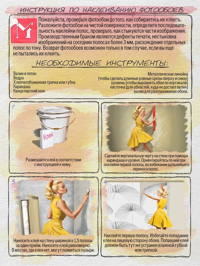 Наши фотобои делаются из очень плотного материала, который при монтаже скрывает многие деффекты стен, но все же необходимо придерживаться некоторых шагов для качественного монтажа: